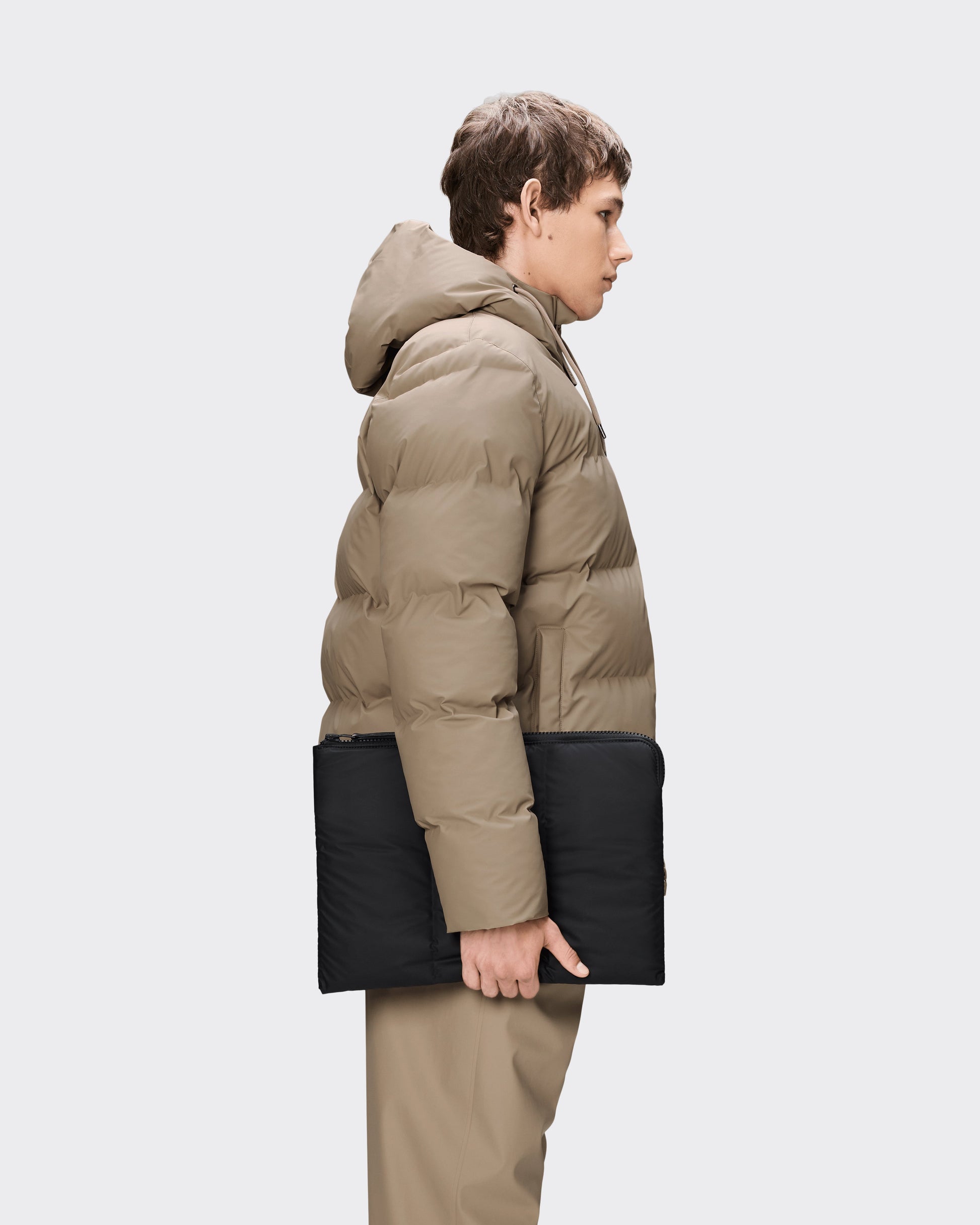 La parte esterna della custodia è morbida e soffice, ma allo stesso tempo resistente, in quanto realizzata con l'iconica estetica a piumino di Rains. All'interno si trova un ampio scomparto principale con morbida fodera che può ospitare laptop da 16".