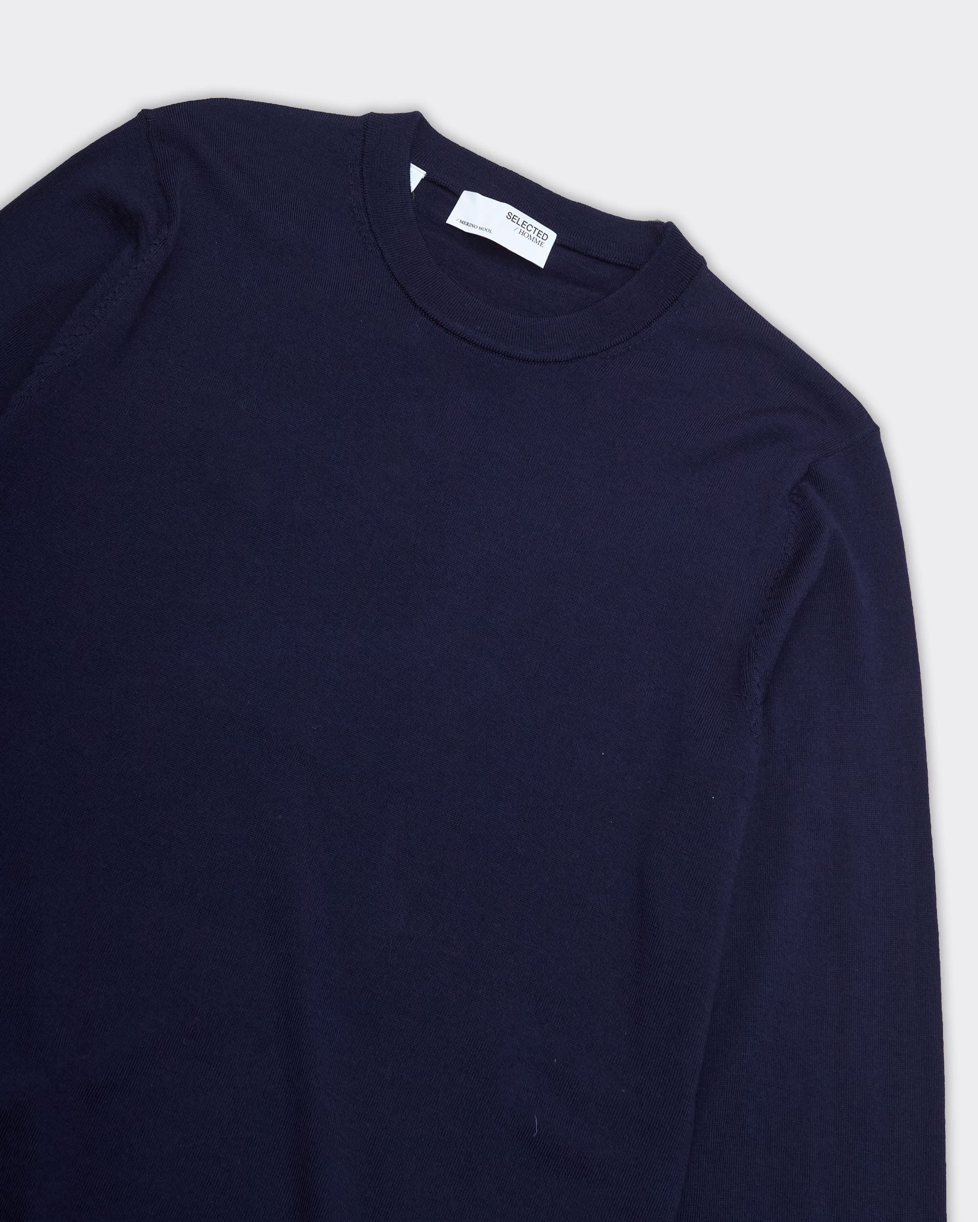 Pullover blu navy in maglia di merino, collo e polsini a costine.