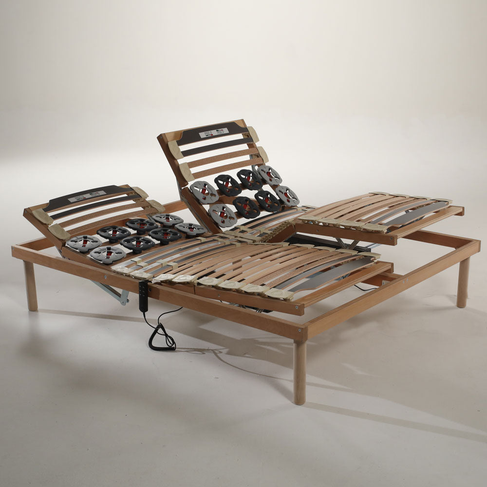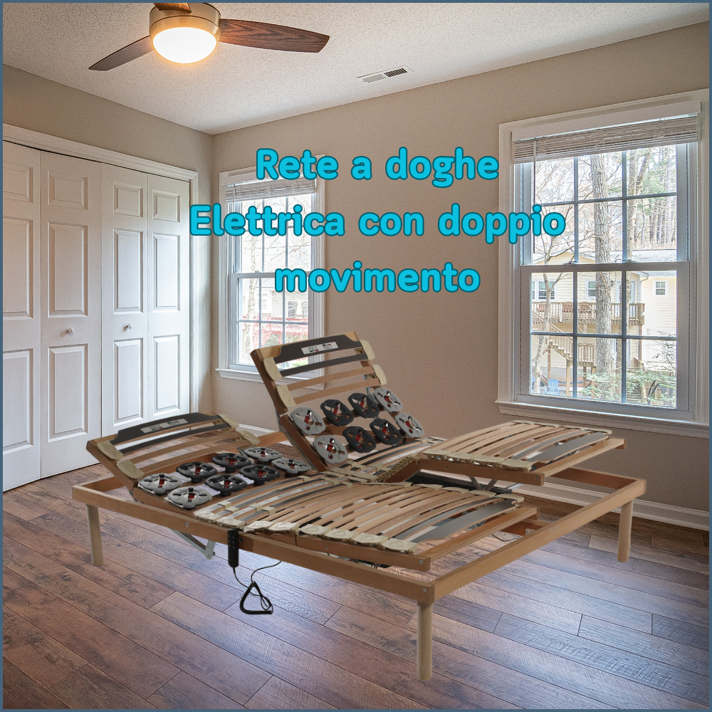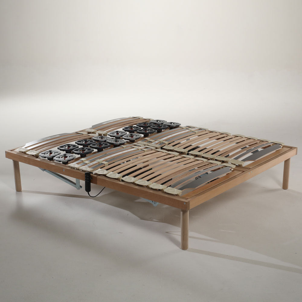 Rete in legno pregiato con 22 doghe tra cui 2 doghe centrali più resistenti di spessore 1,2 cm per supportare i 4 funghi che funzionano da ammortizzatori e massaggianti , 2 doghe in sughero con funzione antiscivolo. Altezza 30 cm le zampe e 9 cm il telaio rinforzato di spessore 5 cm. Rete elettrica con telecomando e motore tedesco. I funghi sono ammortizzatori pneumatici che calibrano perfettamente il peso sostenendo il corpo in maniera adeguata e in modo differenziato nella zona delle spalle.
