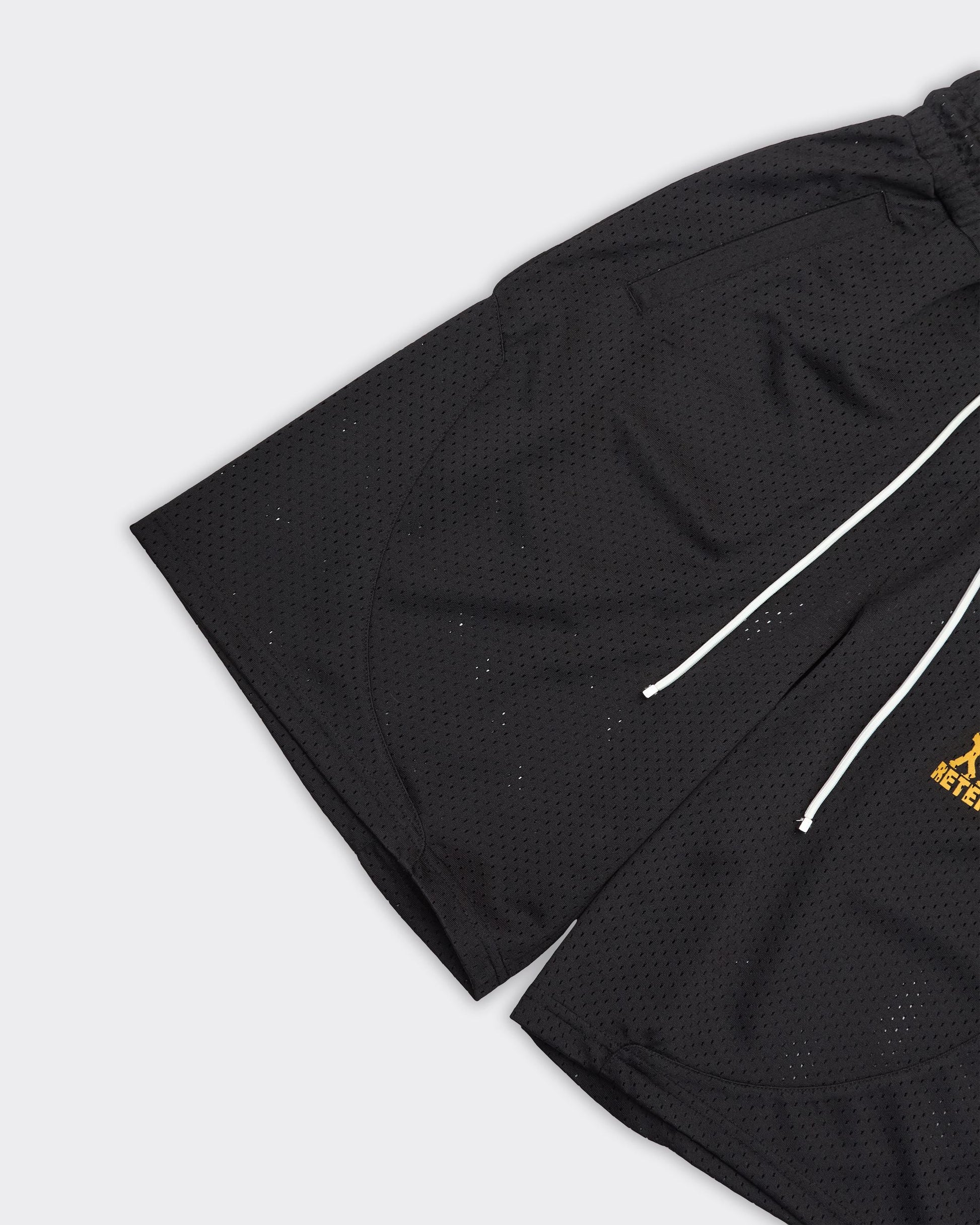 Short nero in tessuto mesh con logo ricamato giallo sul lato anteriore destro.