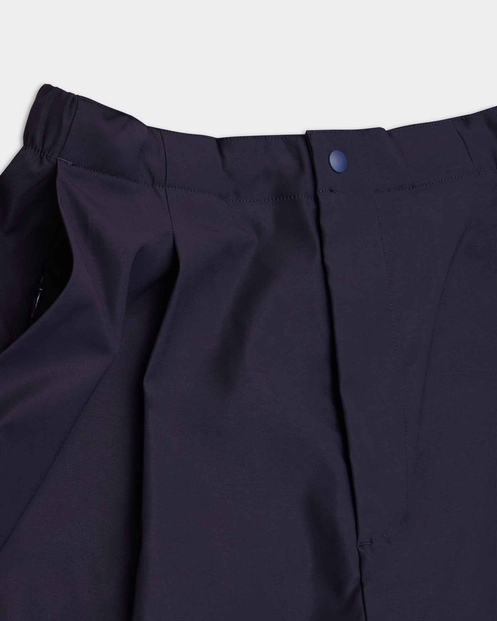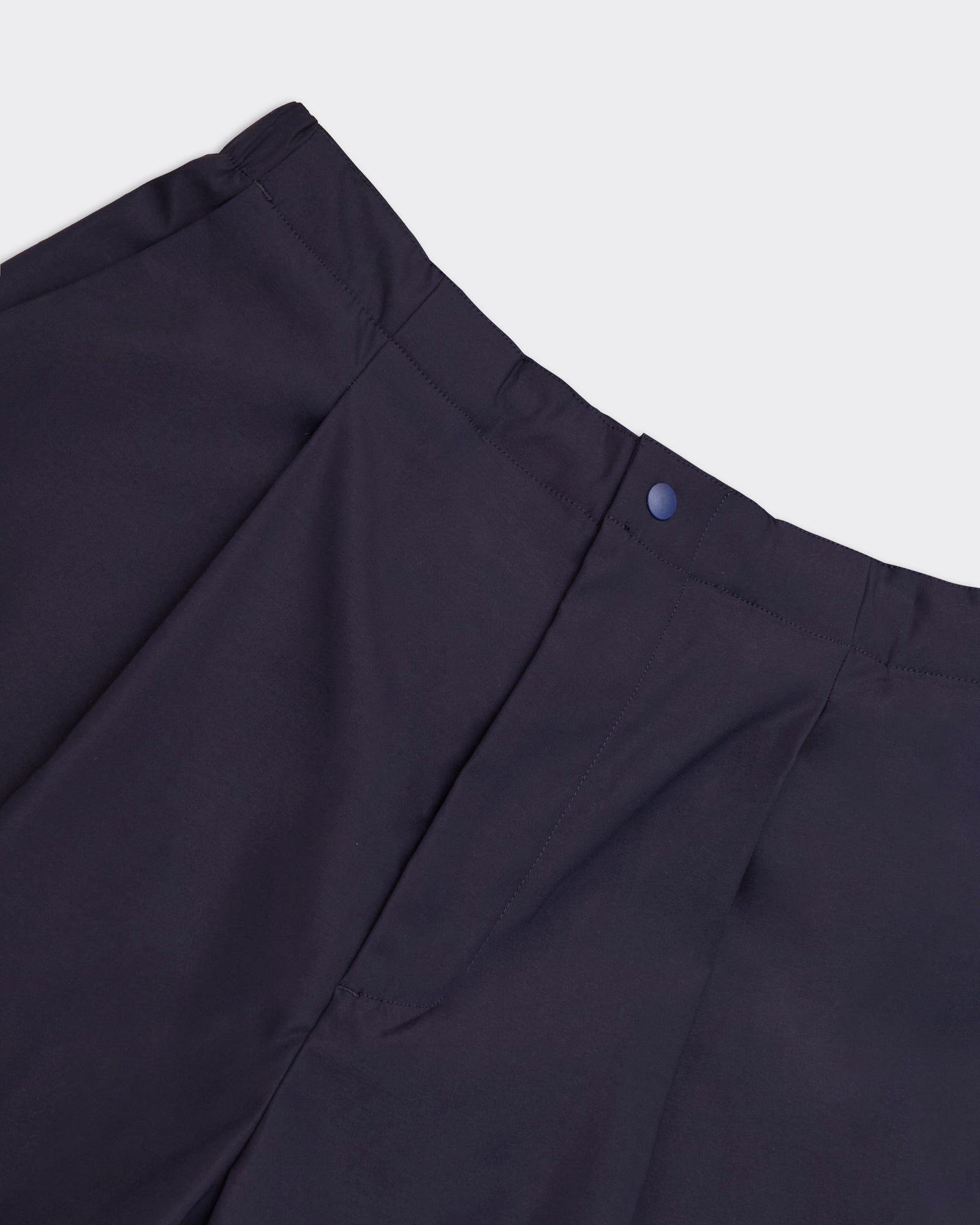 Shorts blu impermeabili con finitura liscia, bottone frontale blu in vita e logo discreto sul retro.
