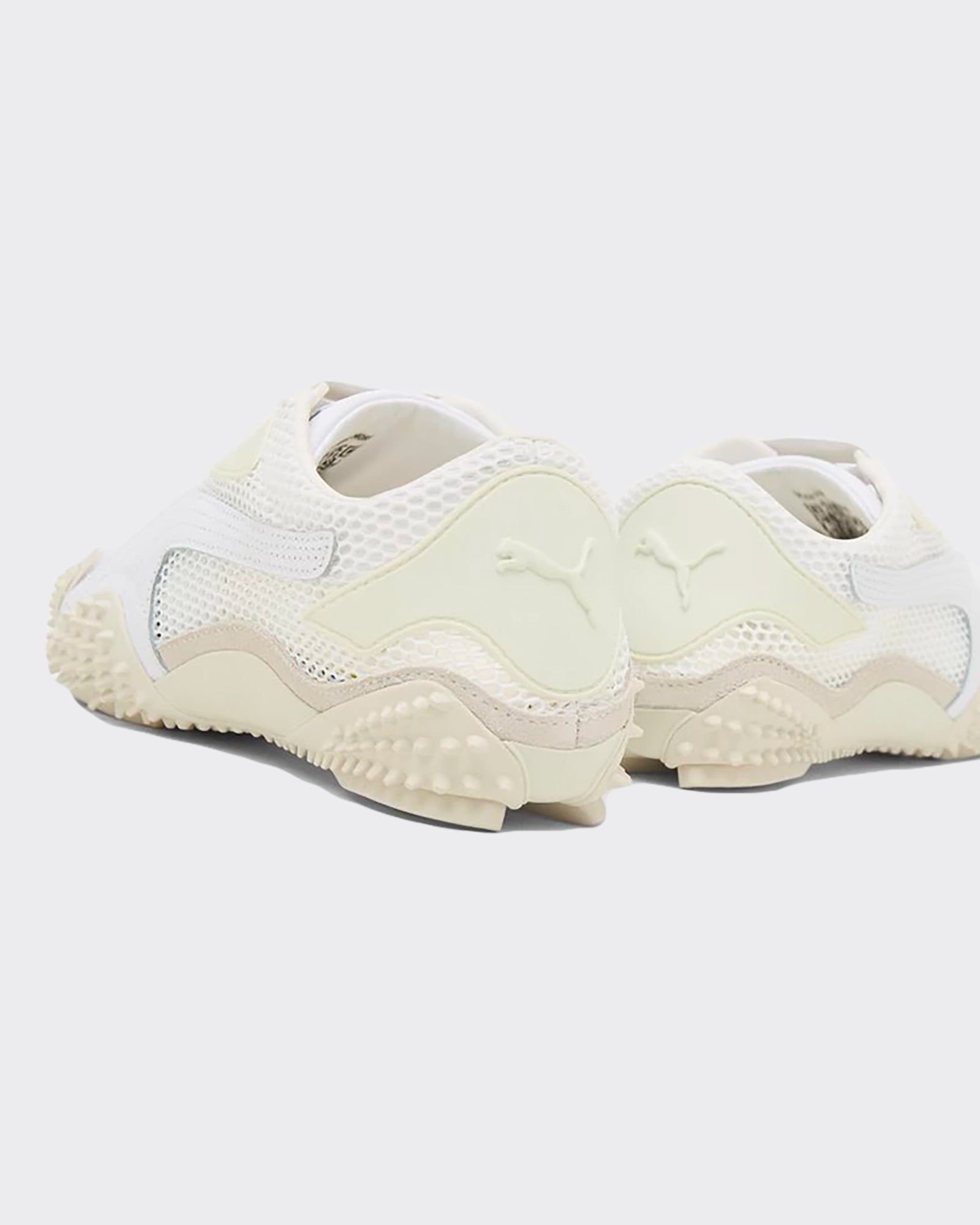 Sneakers bianche e grigio vapore con tomaia in mesh traforato. Dettagli in gomma sul tallone e punta. Elementi decorativi presenti includono un logo laterale e inserti in pvc. Suola con texture a rilievo.