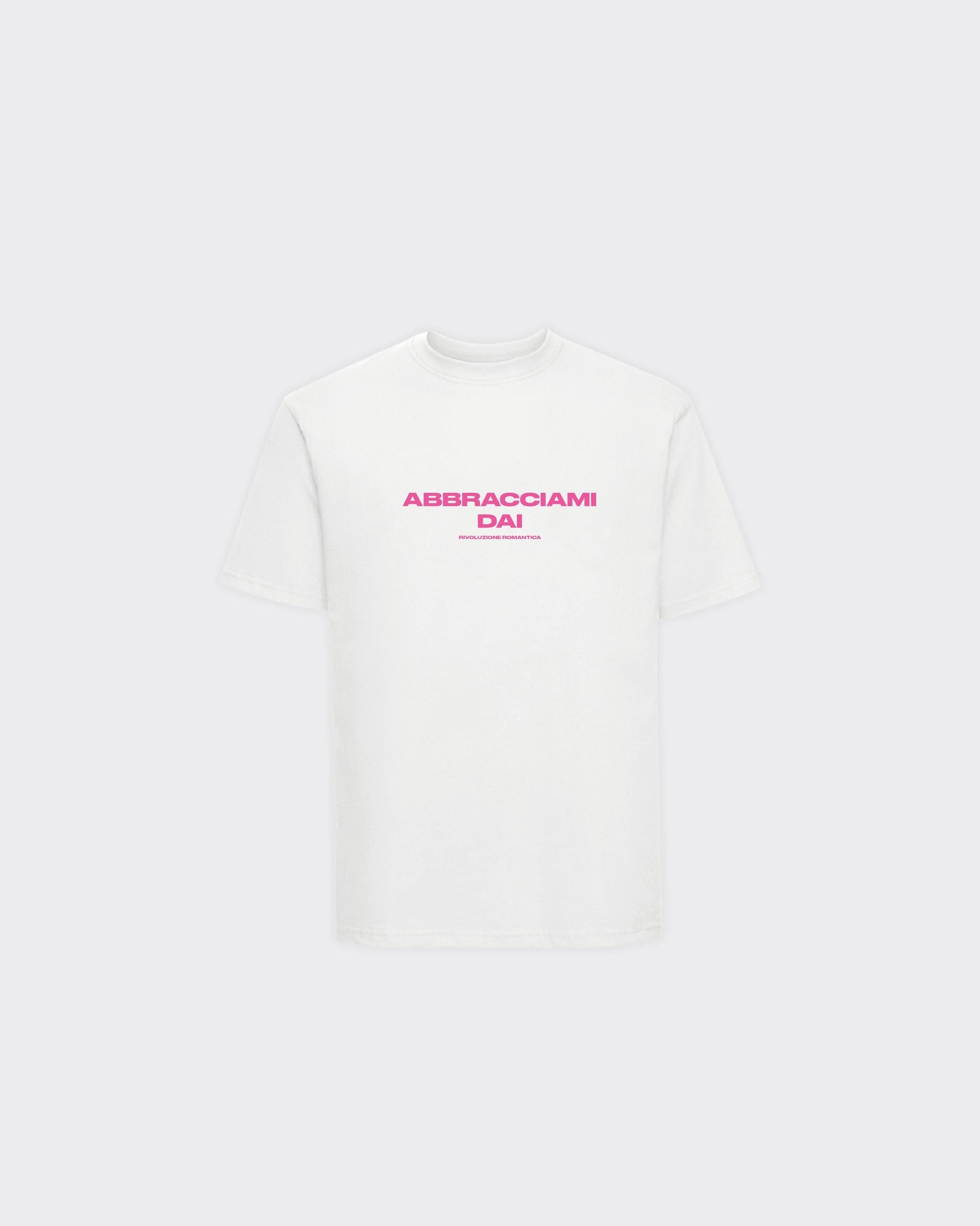 T-shirt bianca con scritta rosa 'Abbracciami Dai' al centro. Nessun altro elemento di design visibile.