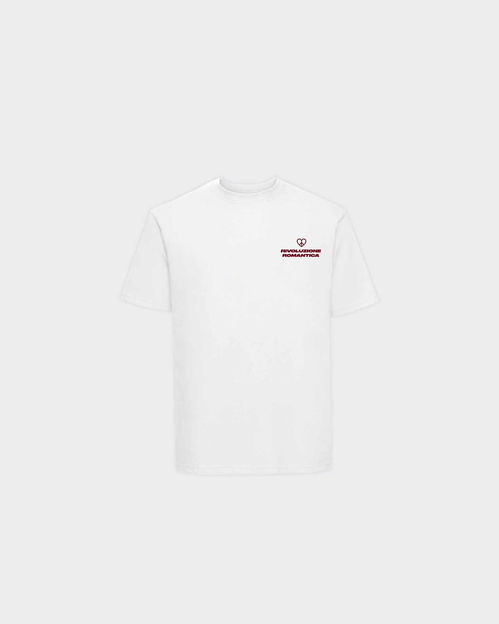 T-Shirt bianca con scritta e cuore rossi sul petto sinistro; stampa rossa grafica sul retro con testo creativo.