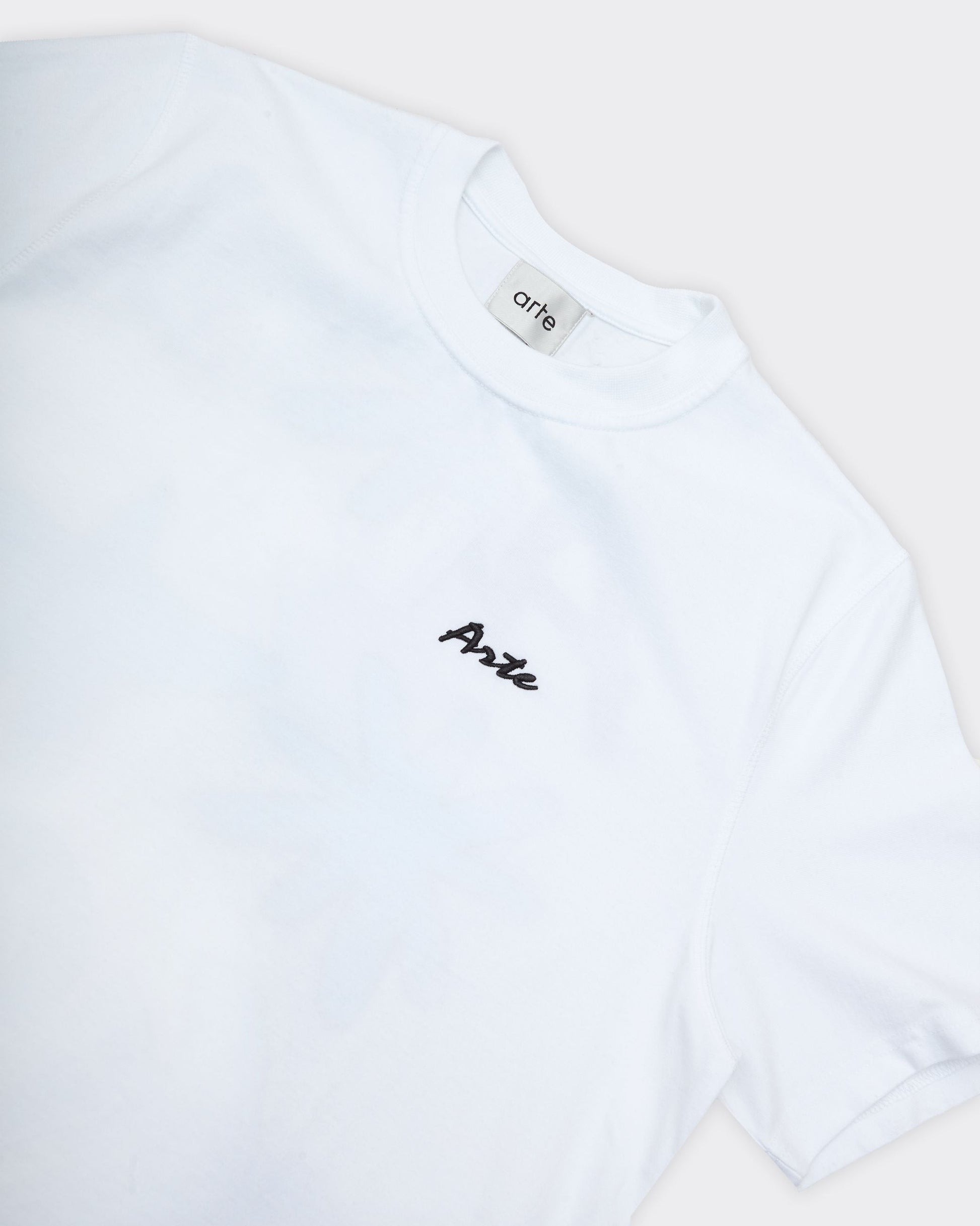 T-shirt bianca con stampa di elementi astratti azzurri sul retro. Logo nero sul petto sinistro.