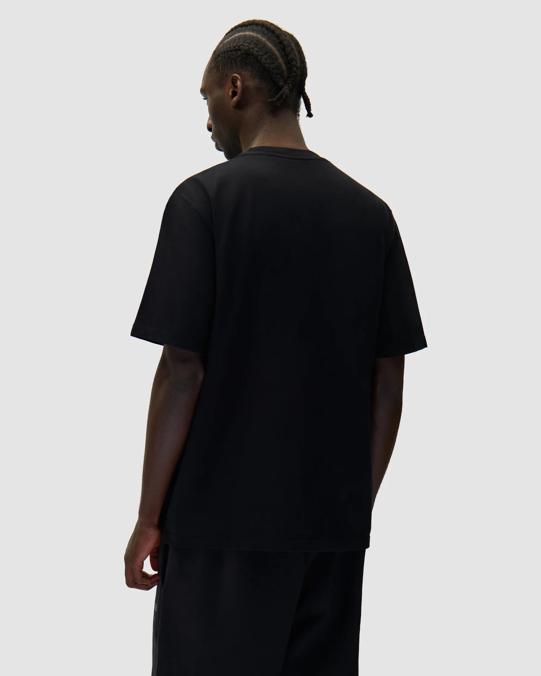 T-shirt nera con piccolo ricamo bianco a forma di cuore e testo sul petto. Realizzata in tessuto liscio.
