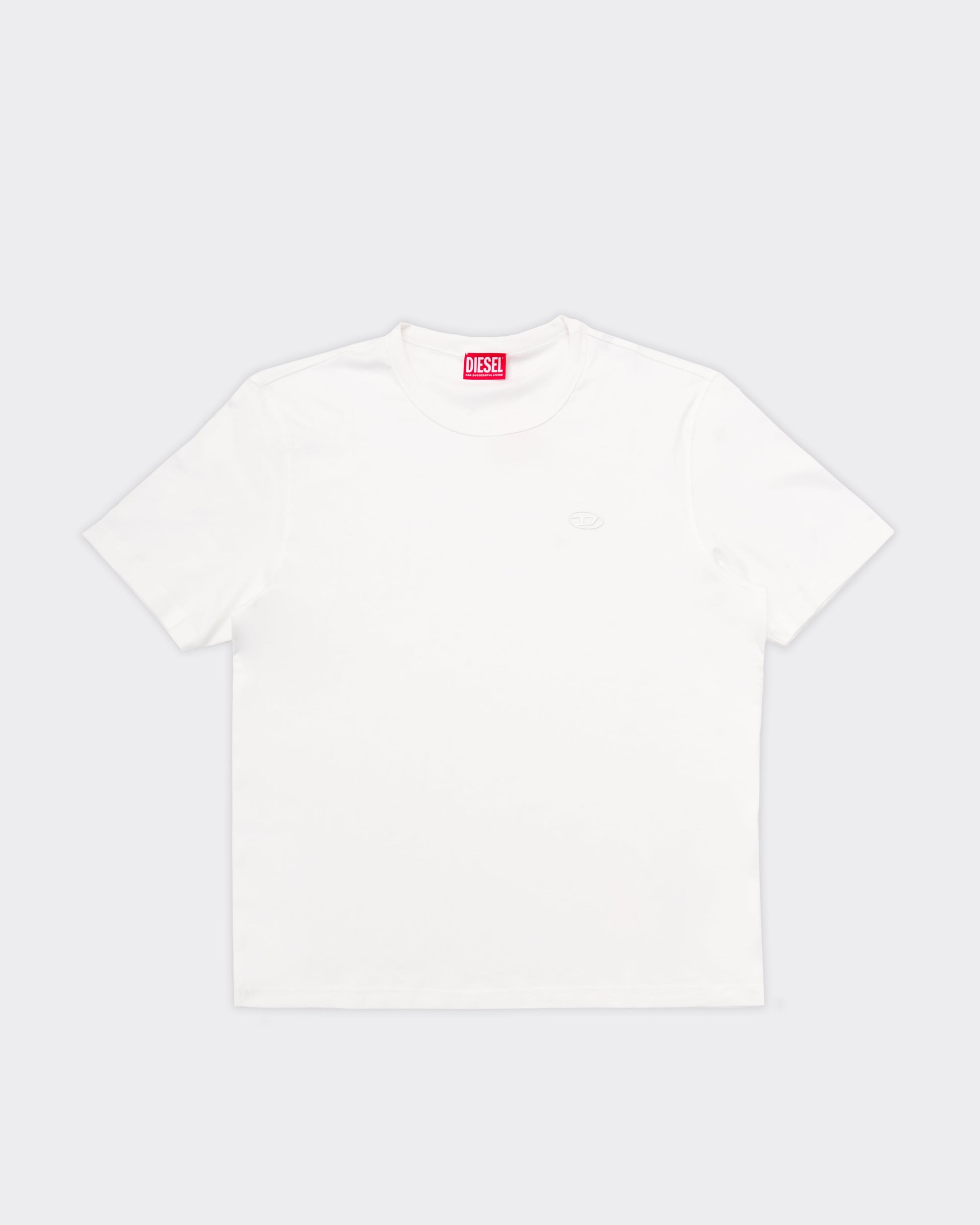 T-shirt bianca con logo ricamato sul petto e etichetta interna al collo.