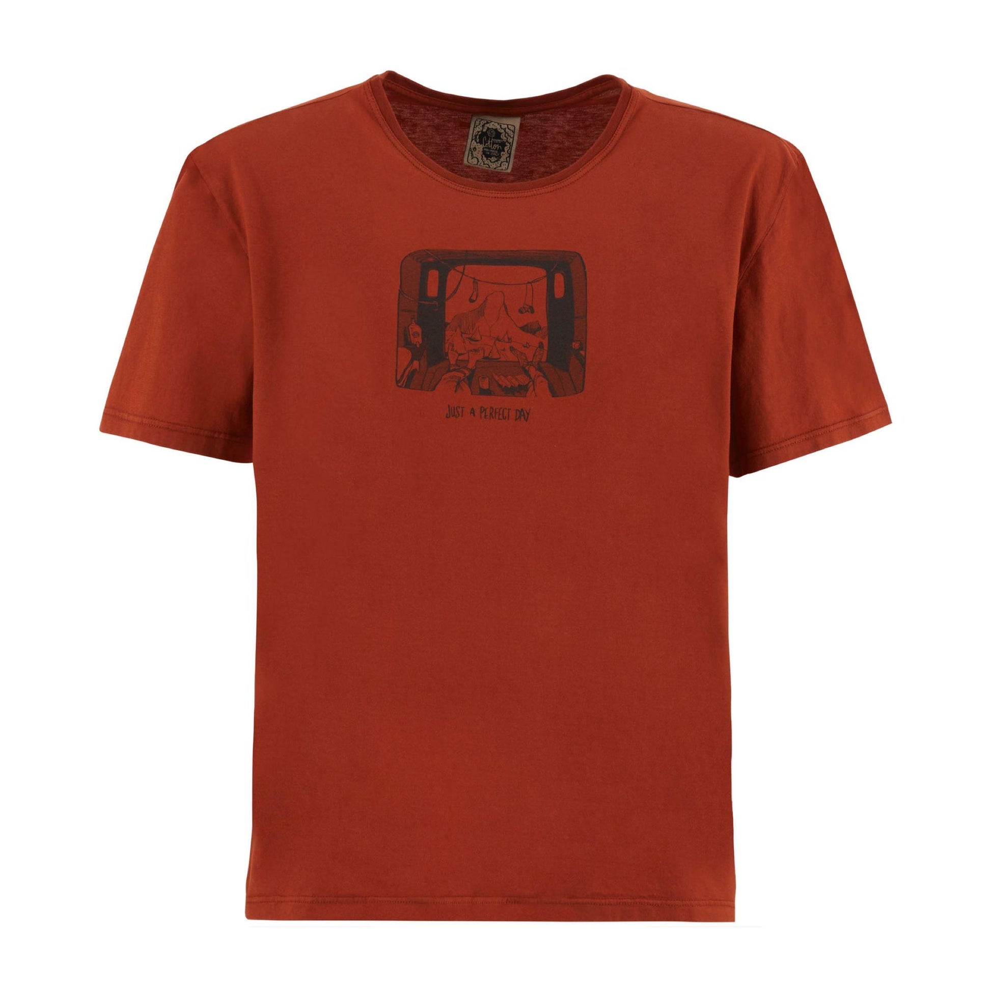 La T-shirt E9 Van, modello S22-UTE006 RedClay, è realizzata in cotone organico leggero, garantendo comfort e mobilità. Con una stampa sul davanti e una vestibilità regolare, è prodotta in Italia, enfatizzando la qualità e l'attenzione al dettaglio.