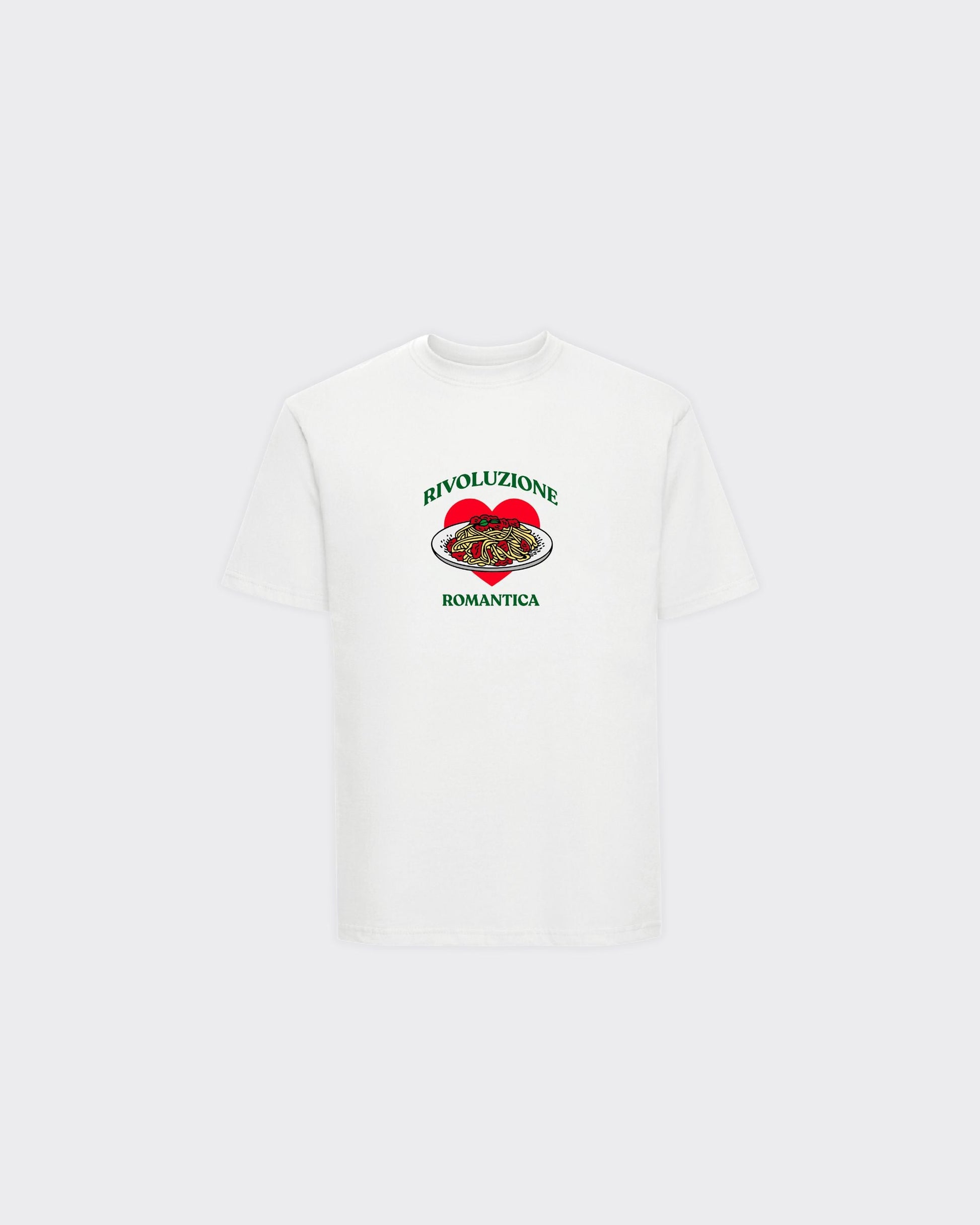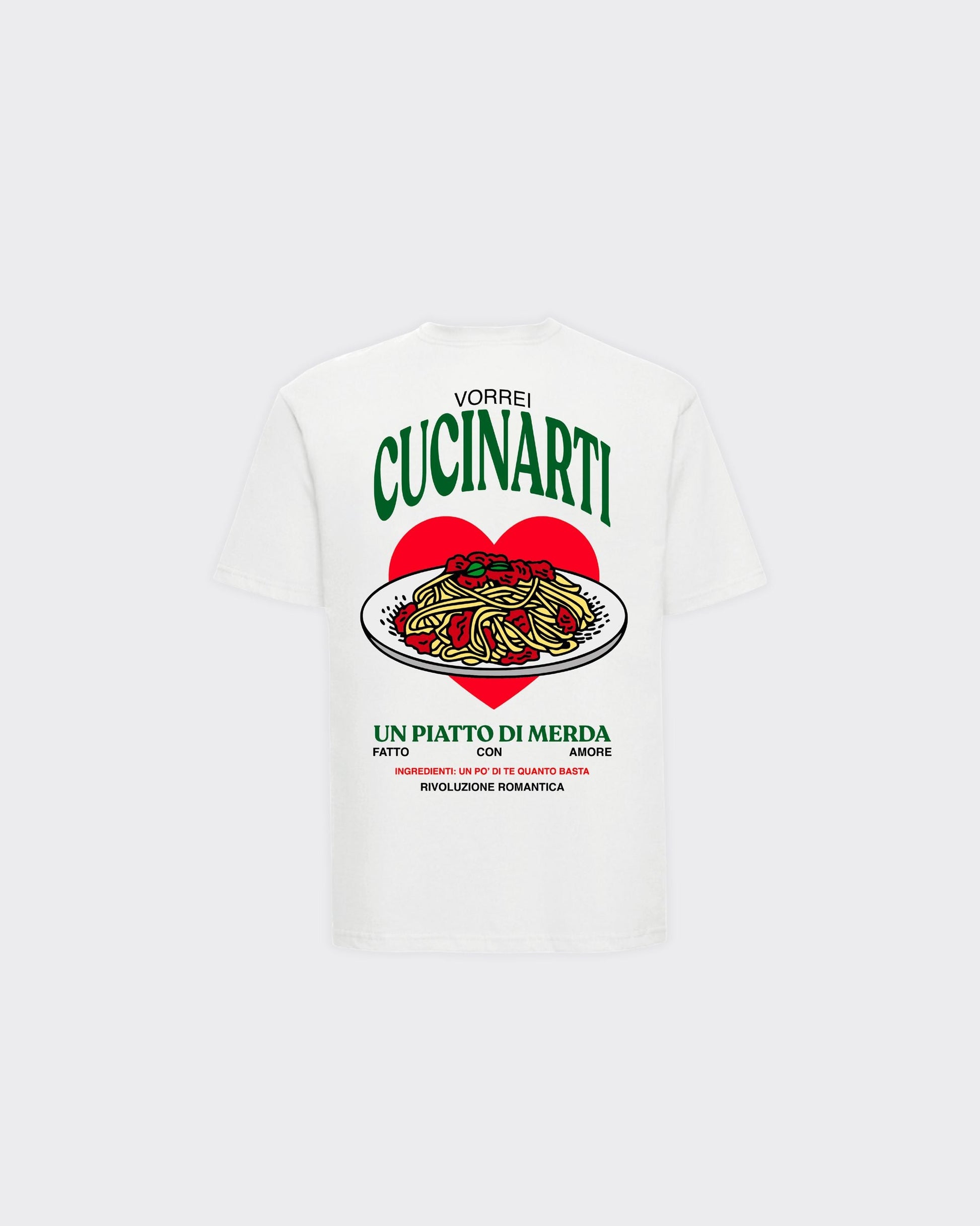 T-shirt bianca in cotone con stampa frontale e posteriore di un piatto di spaghetti sopra un cuore rosso, accompagnata da varie scritte in verde e rosso.
