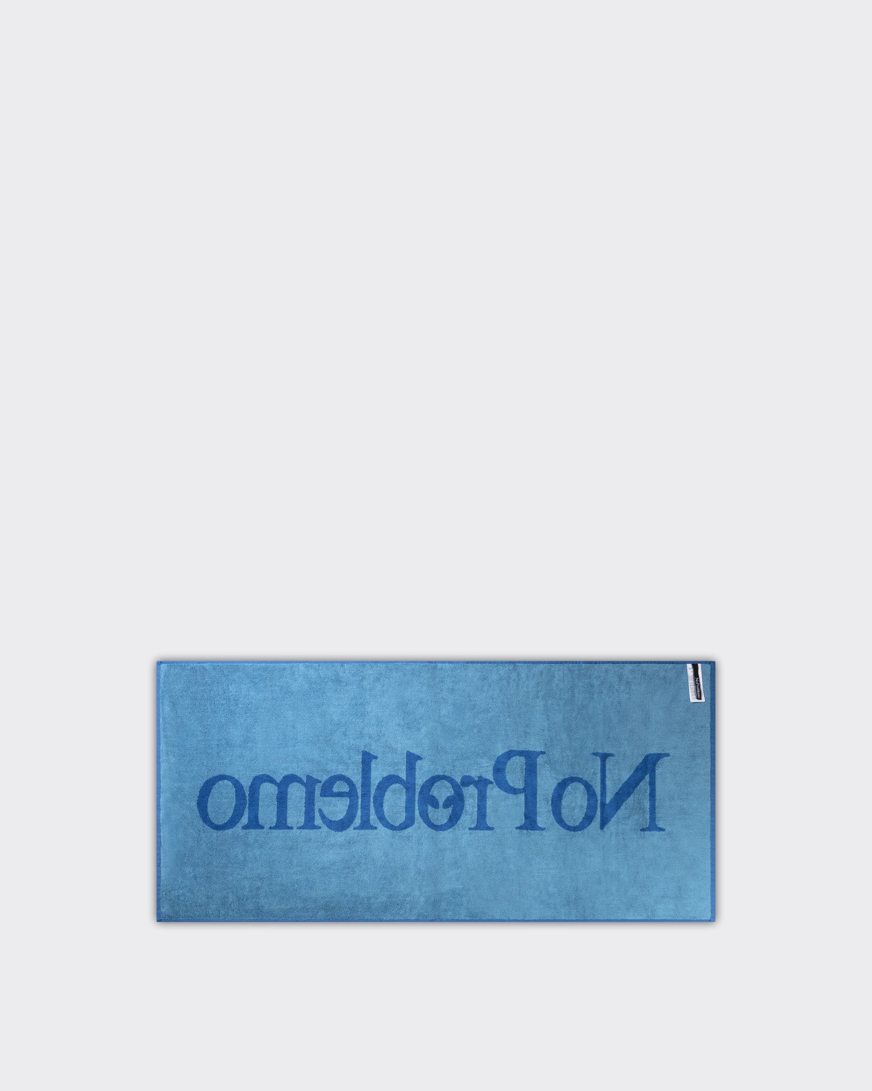 Telo mare di colore blu con logo grande No Problemo sul fronte.
