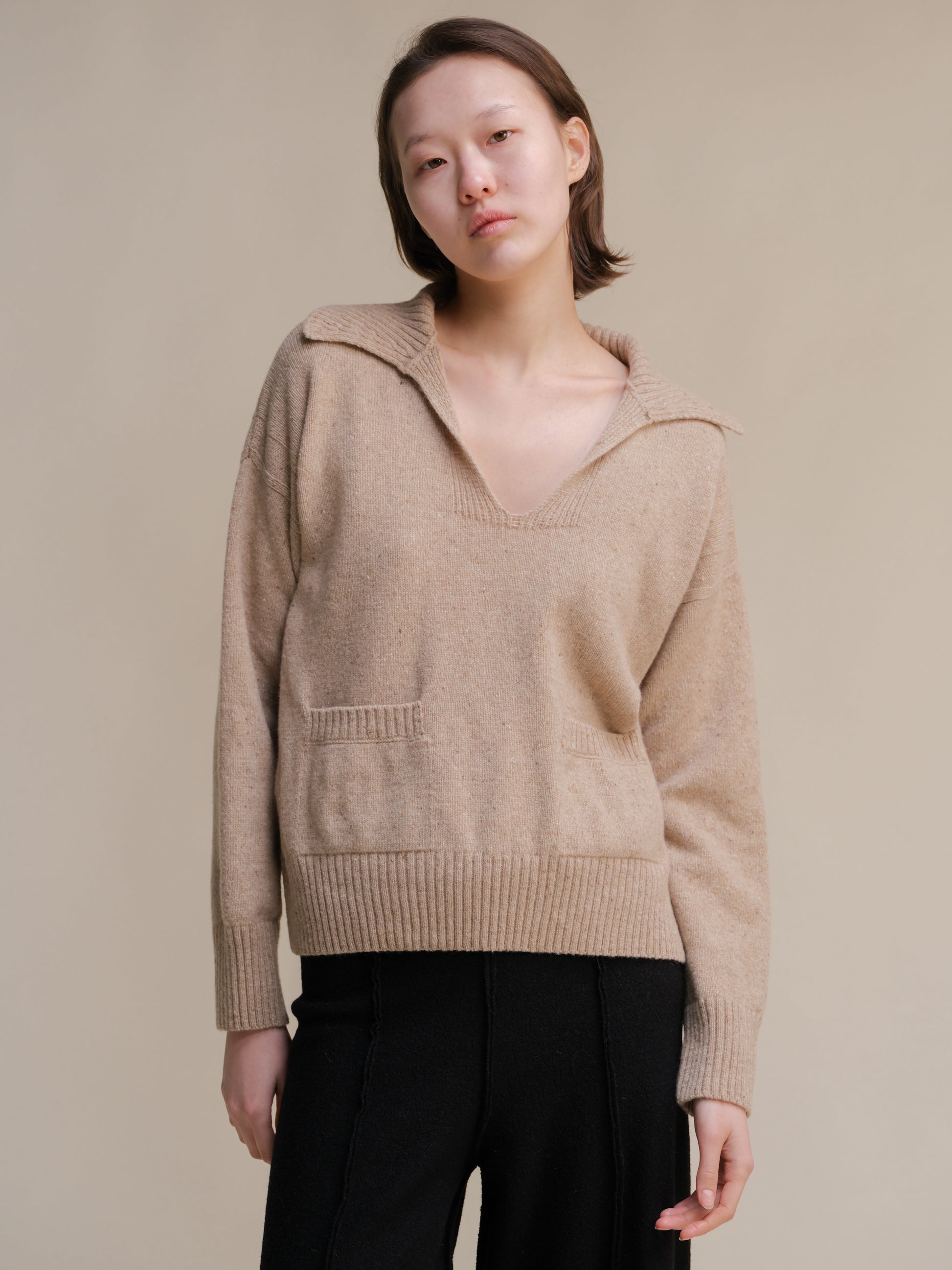 Oversized polo with front pockets, featuring a tweed-style texture for a modern and sophisticated look. Made from a blend of recycled wool (GRS), virgin wool, and recycled polyamide (GRS), combining quality, comfort, and sustainability. The relaxed fit and functional pockets add a contemporary and practical touch. Crafted in Tuscany with attention to detail and a responsible approach.