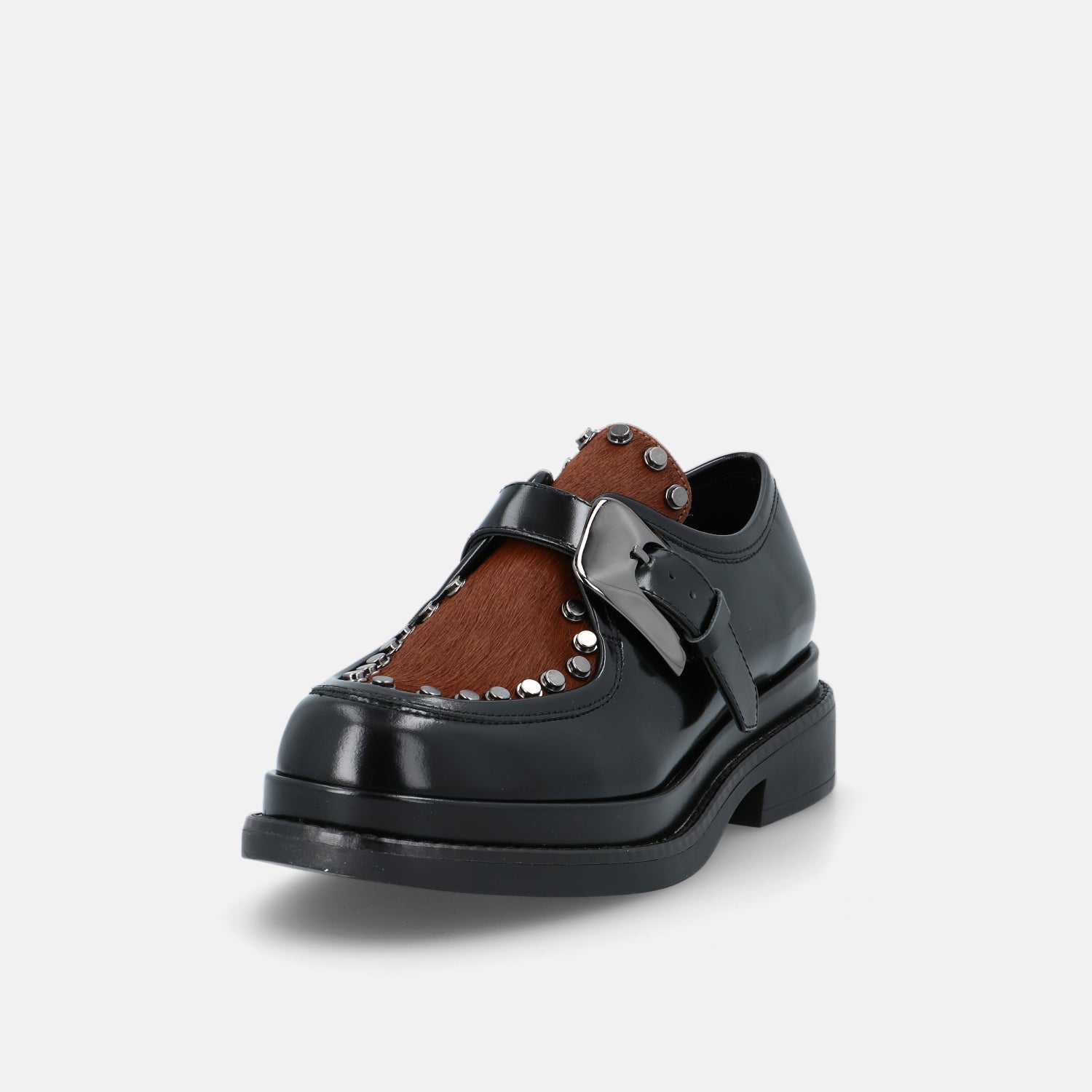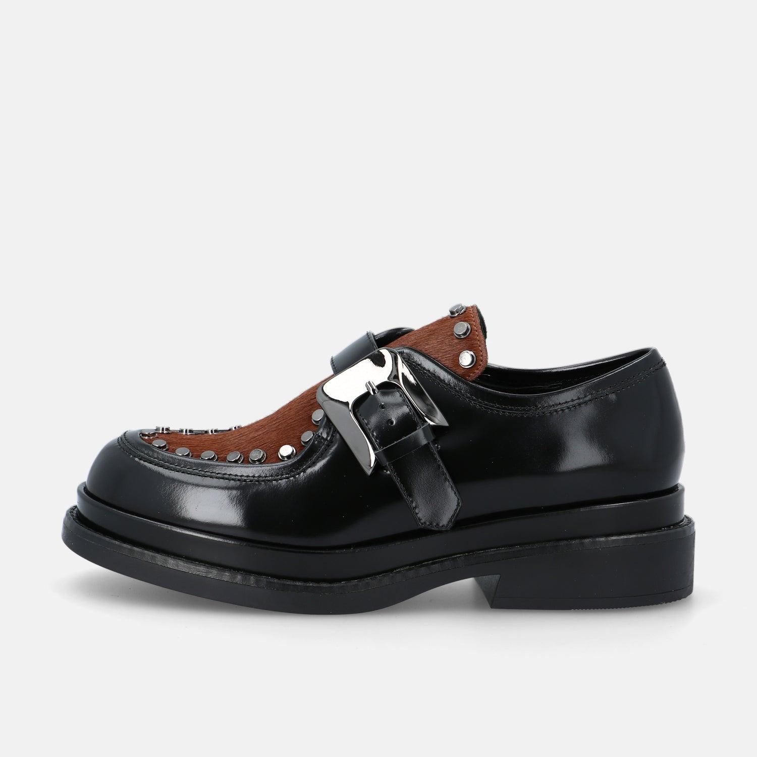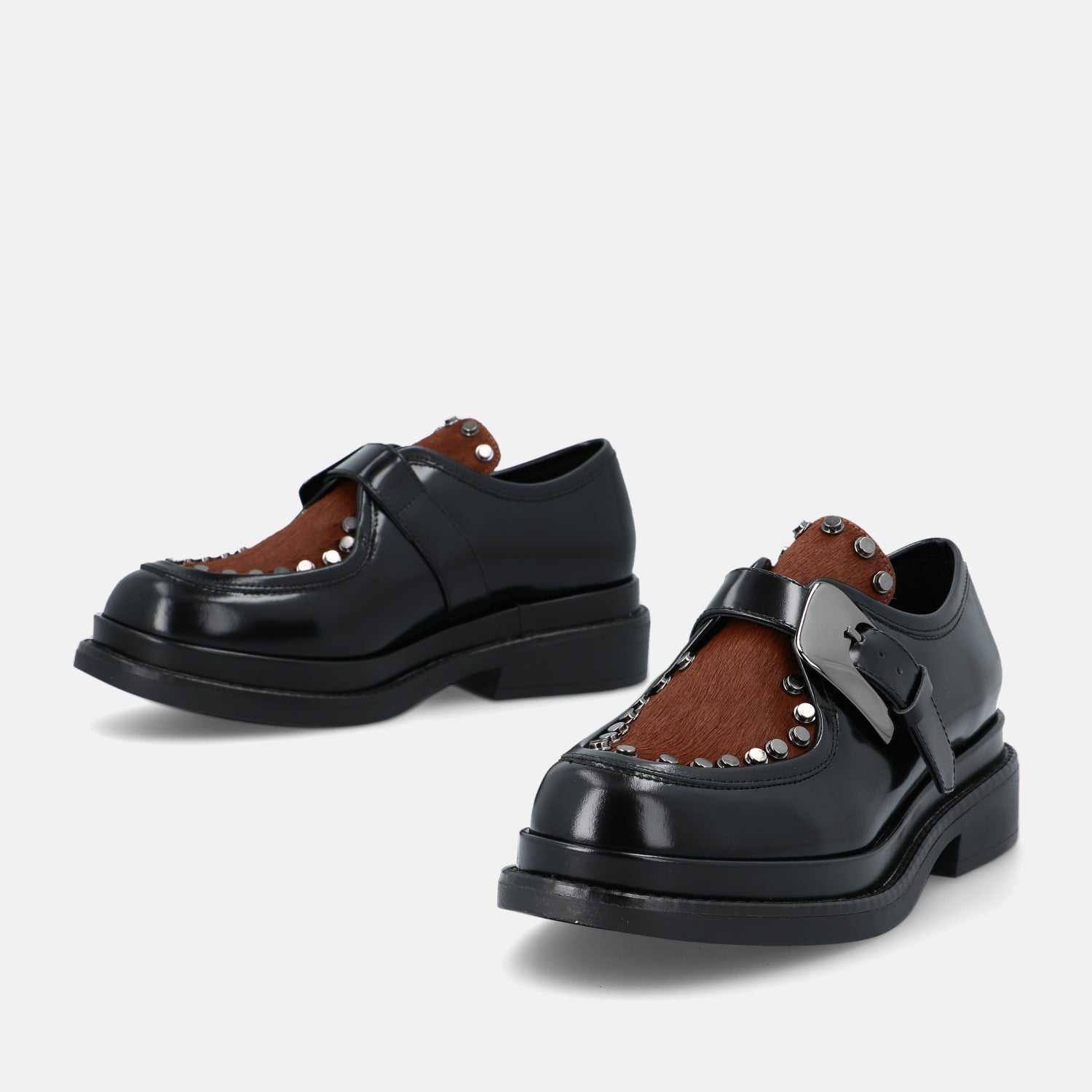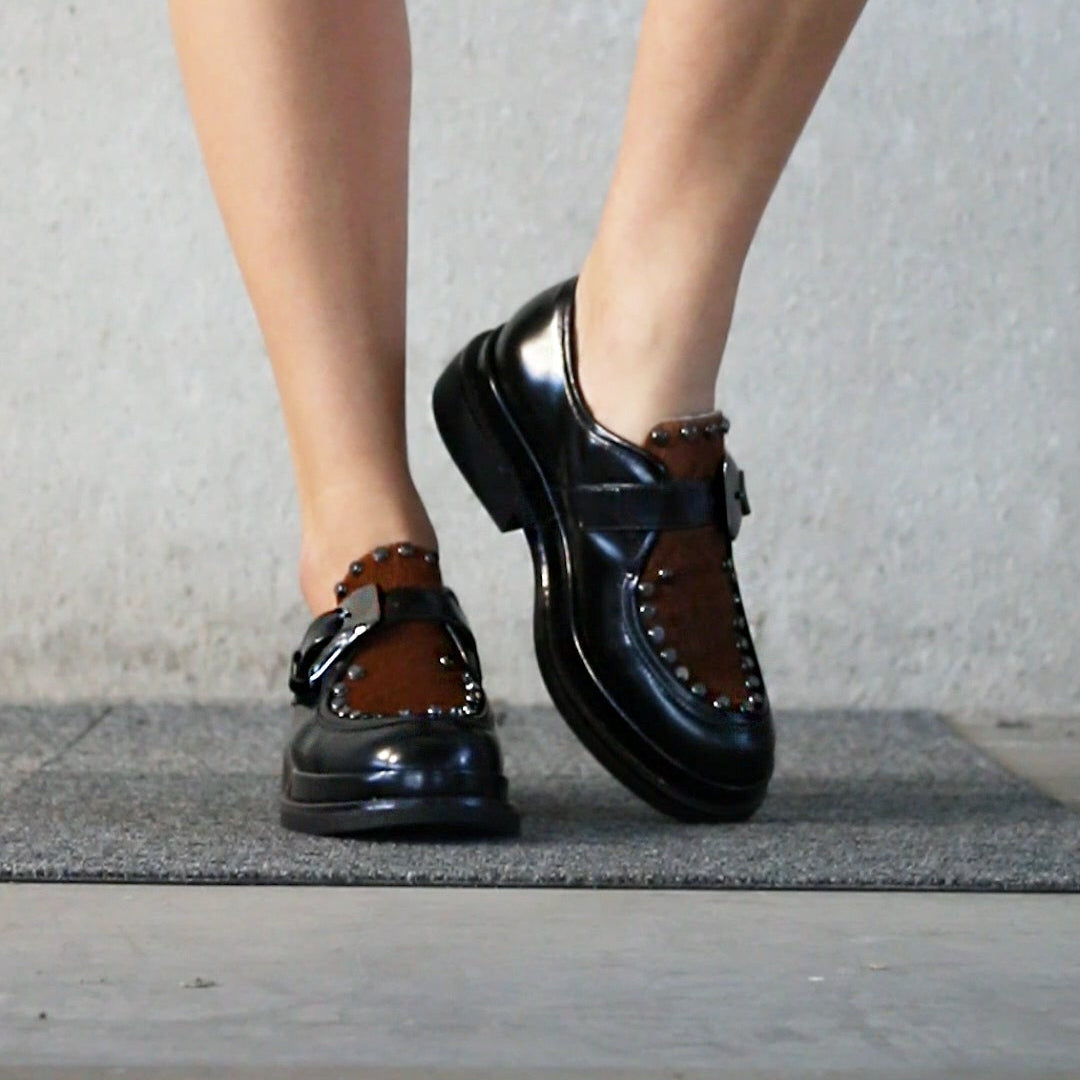 Le scarpe Upla Boda sono un modello dallo spirito deciso che unisce artigianalità e carattere contemporaneo. Realizzate in pelle lucida nera, si distinguono per il raffinato dettaglio in cavallino marrone che ne sottolinea il design originale. La maxi fibbia laterale e le borchie metalliche che incorniciano la tomaia aggiungono un tocco rock e ricercato, trasformando un classico modello maschile in una calzatura dallo stile grintoso e femminile.