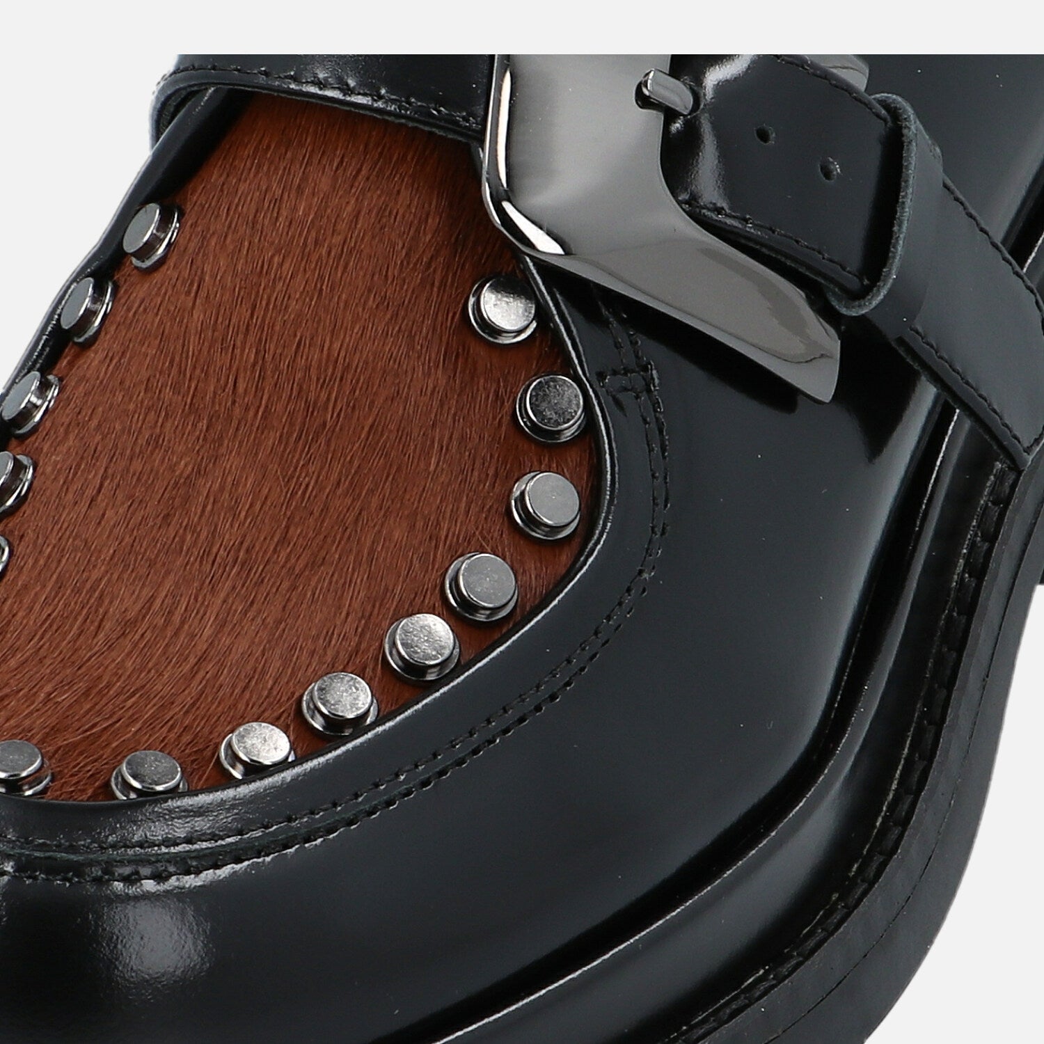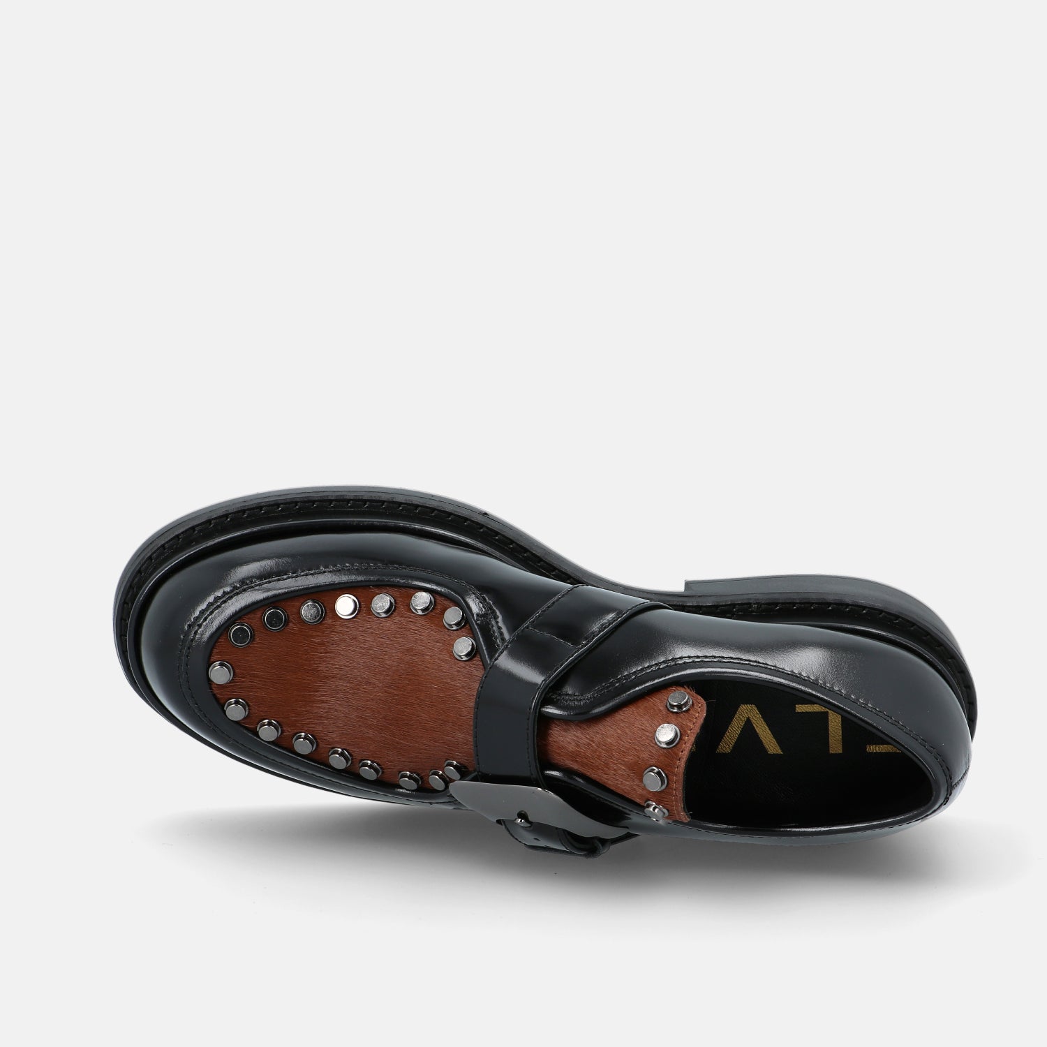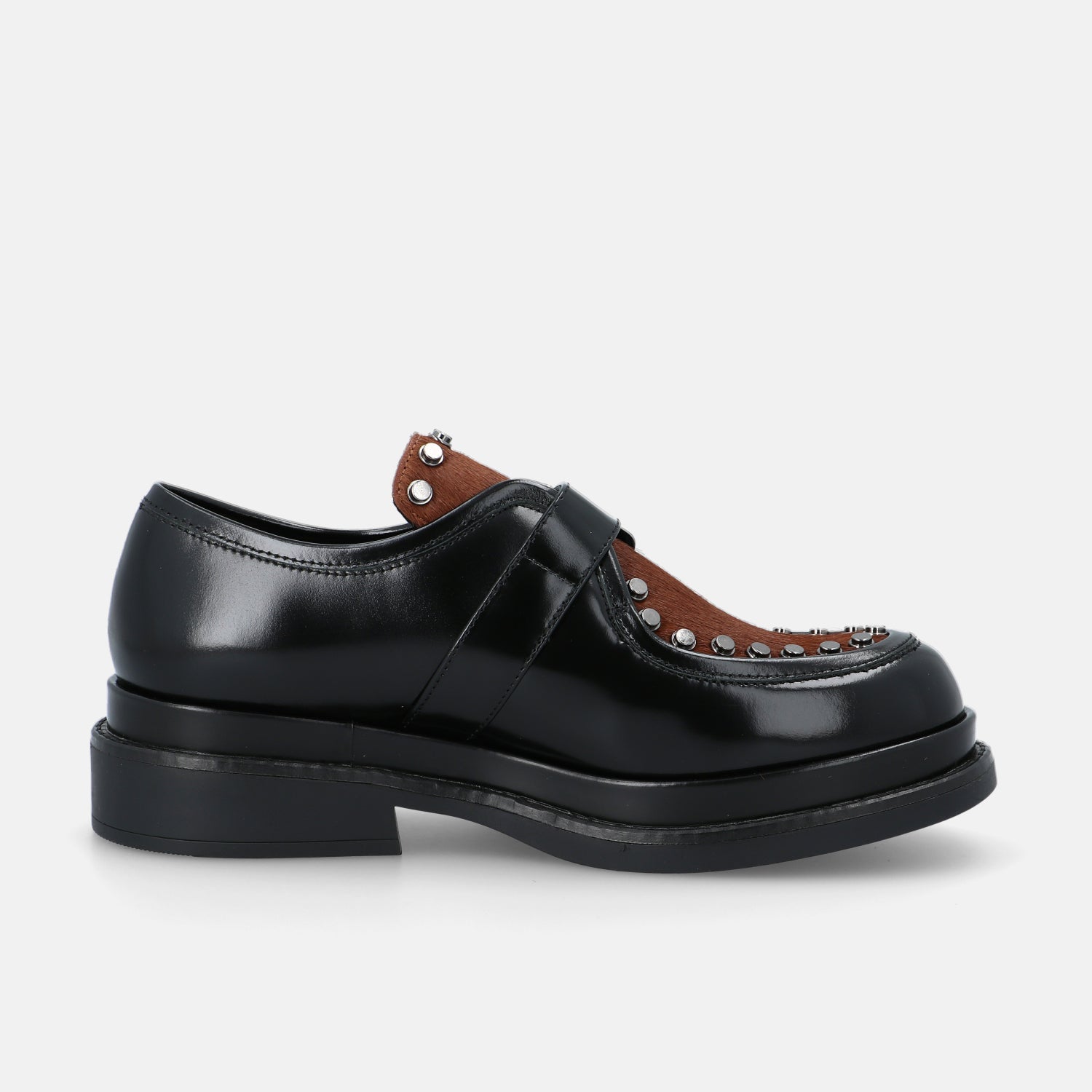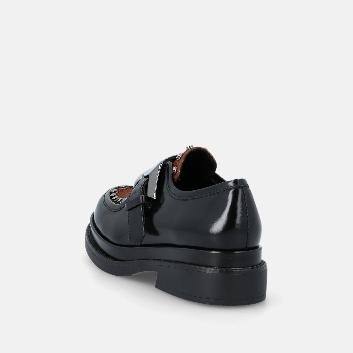 Le scarpe Upla Boda sono un modello dallo spirito deciso che unisce artigianalità e carattere contemporaneo. Realizzate in pelle lucida nera, si distinguono per il raffinato dettaglio in cavallino marrone che ne sottolinea il design originale. La maxi fibbia laterale e le borchie metalliche che incorniciano la tomaia aggiungono un tocco rock e ricercato, trasformando un classico modello maschile in una calzatura dallo stile grintoso e femminile.