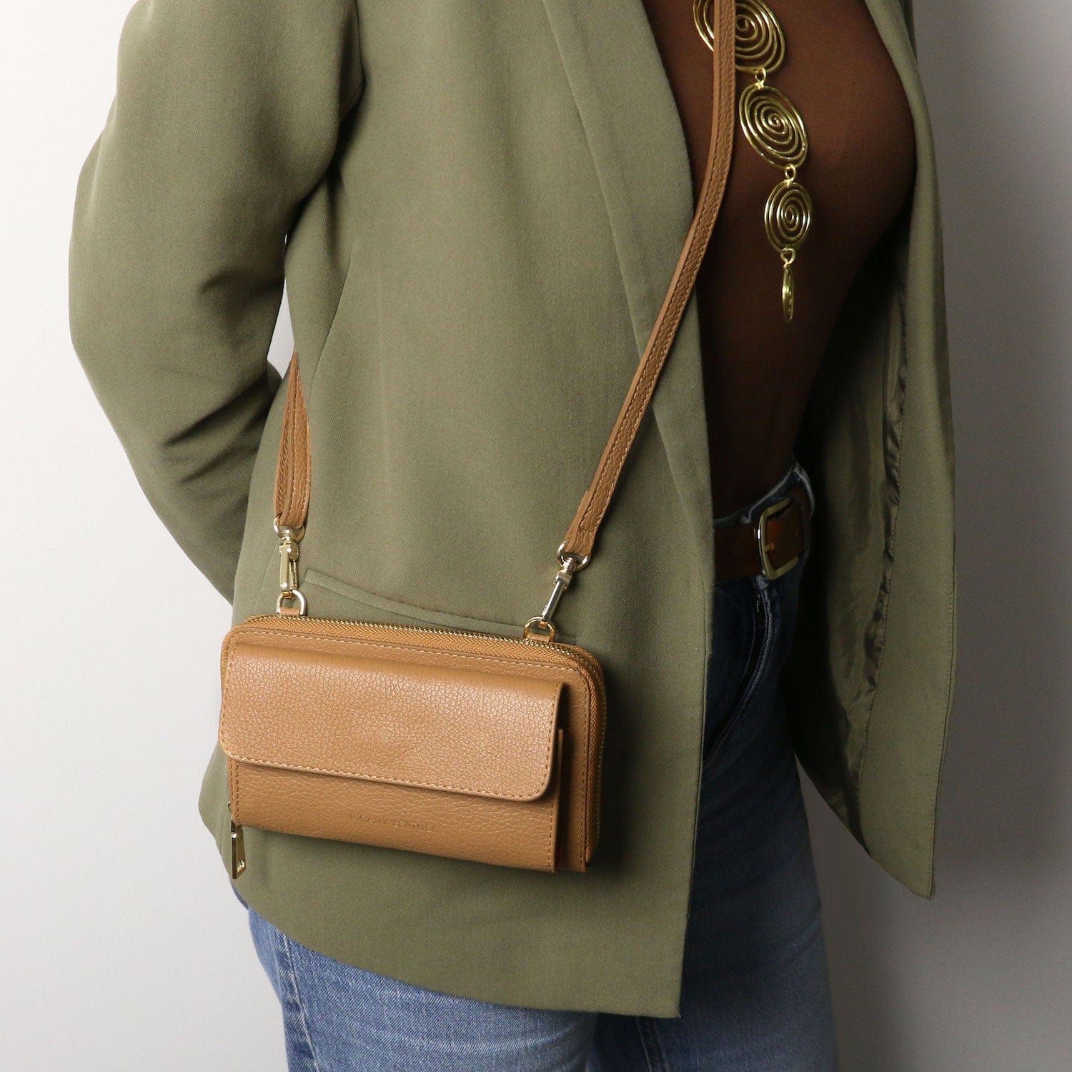 Step up your game with one of these fabulous little leather shoulder bags, crafted from premium pebbled leather right from the heart of Italy. Designed for both fashion and function, this chic leather phone wallet with a strap offers two roomy compartments secured by zips and a snap button to keep your essentials safe and sound.