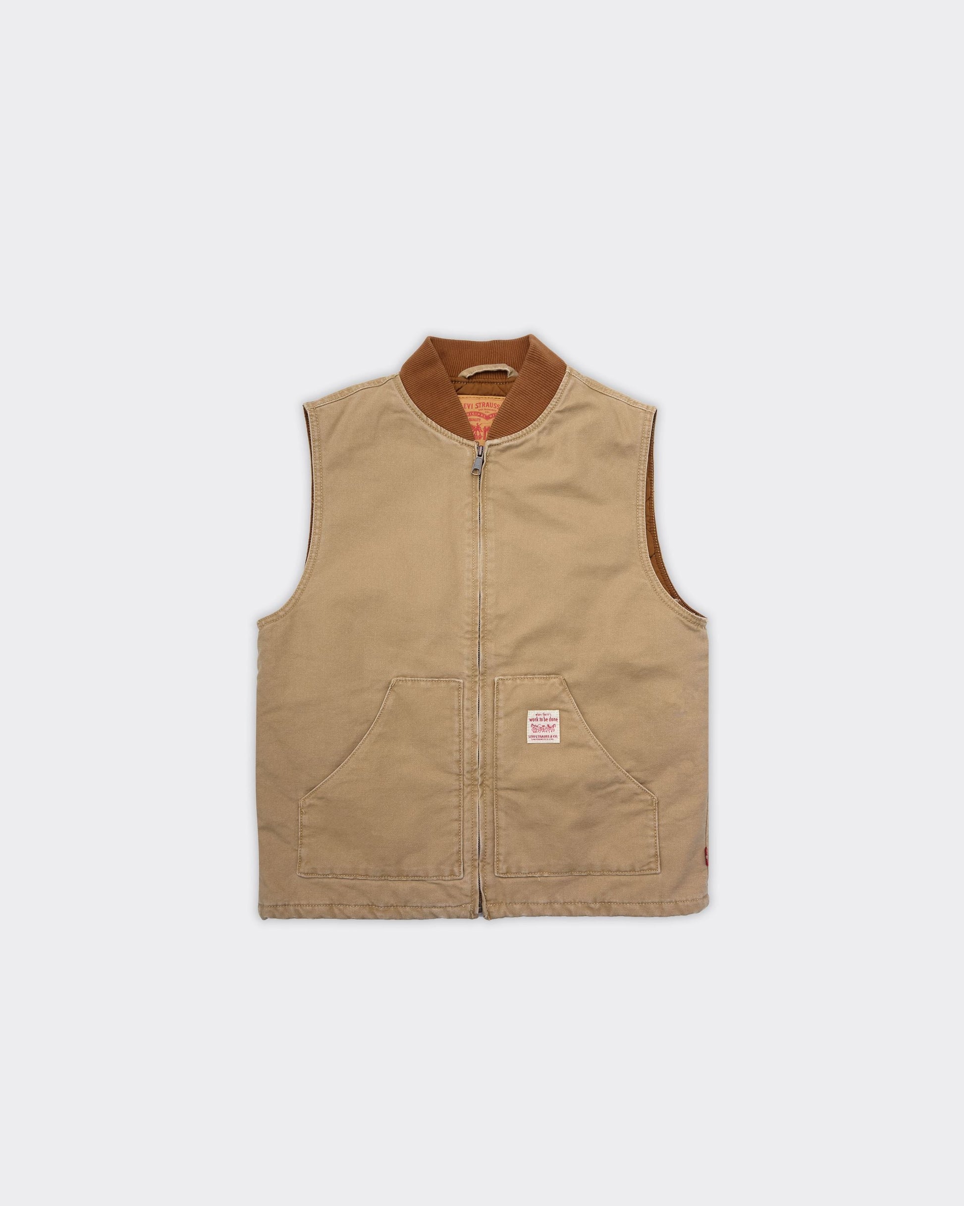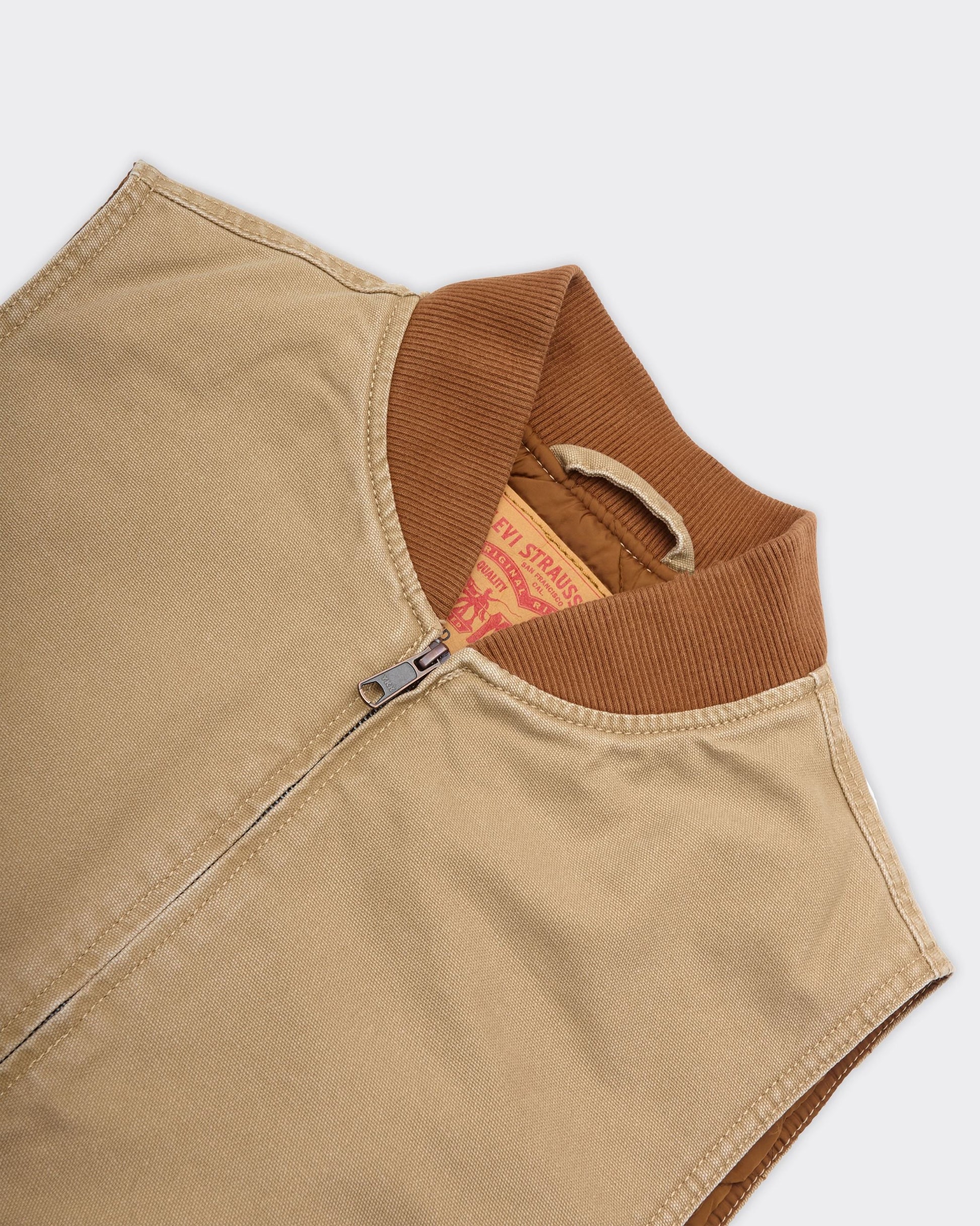 Vest marrone con zip frontale e colletto a costine marrone. Due tasche frontali. Etichetta applicata sulla tasca destra.