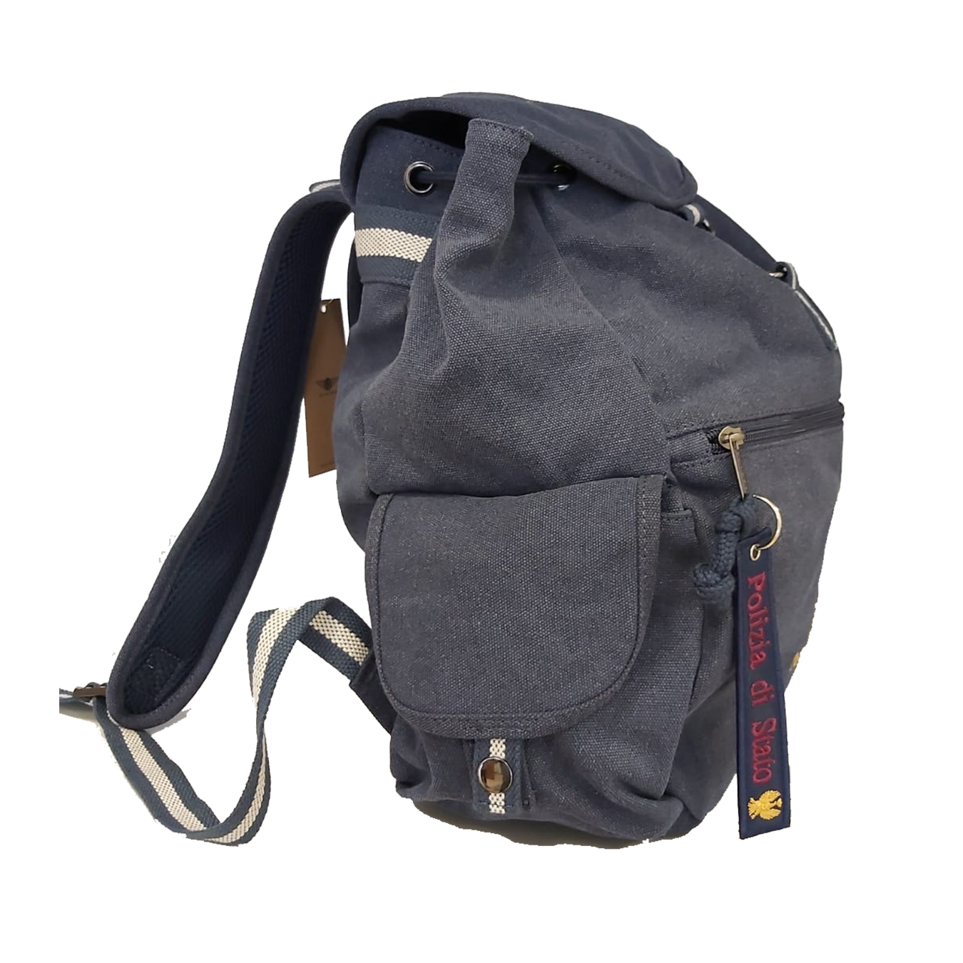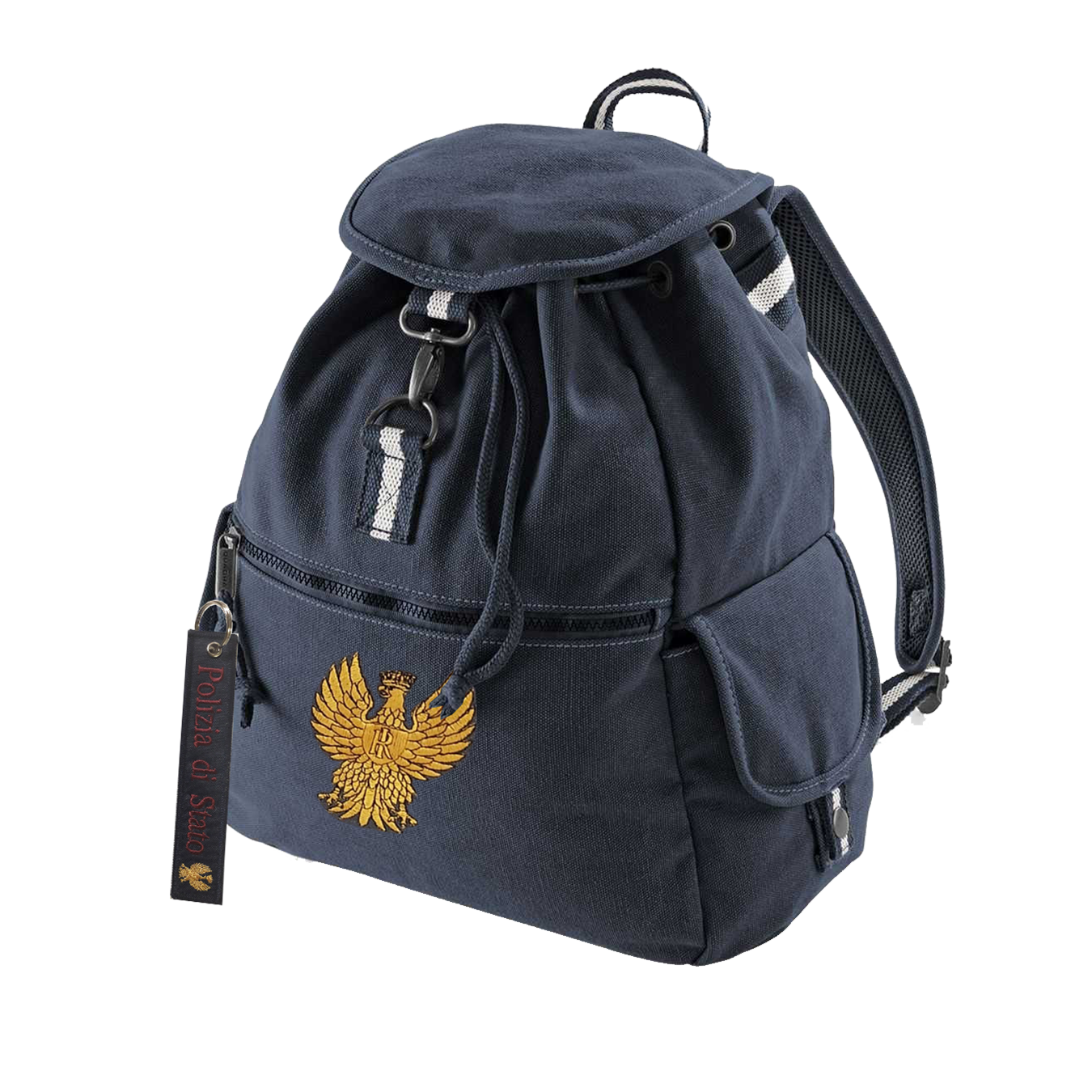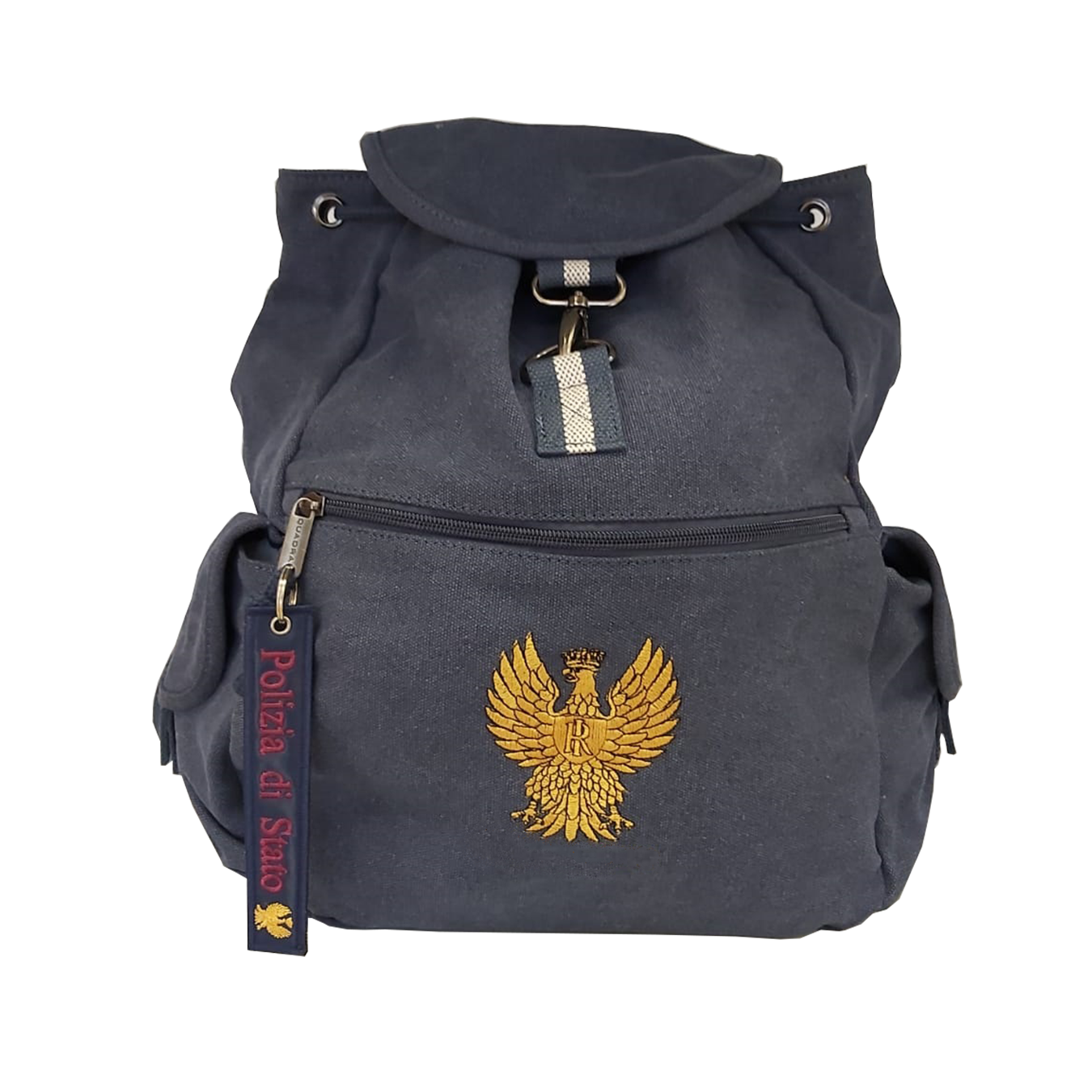 Zaino con ricamo frontale fregio Polizia di Stato e portachiavi Polizia di Stato, 100% cotone Canvas. Zaino in stile vintage con chiusura principale con cordoncino, particolari in metallo anticato,