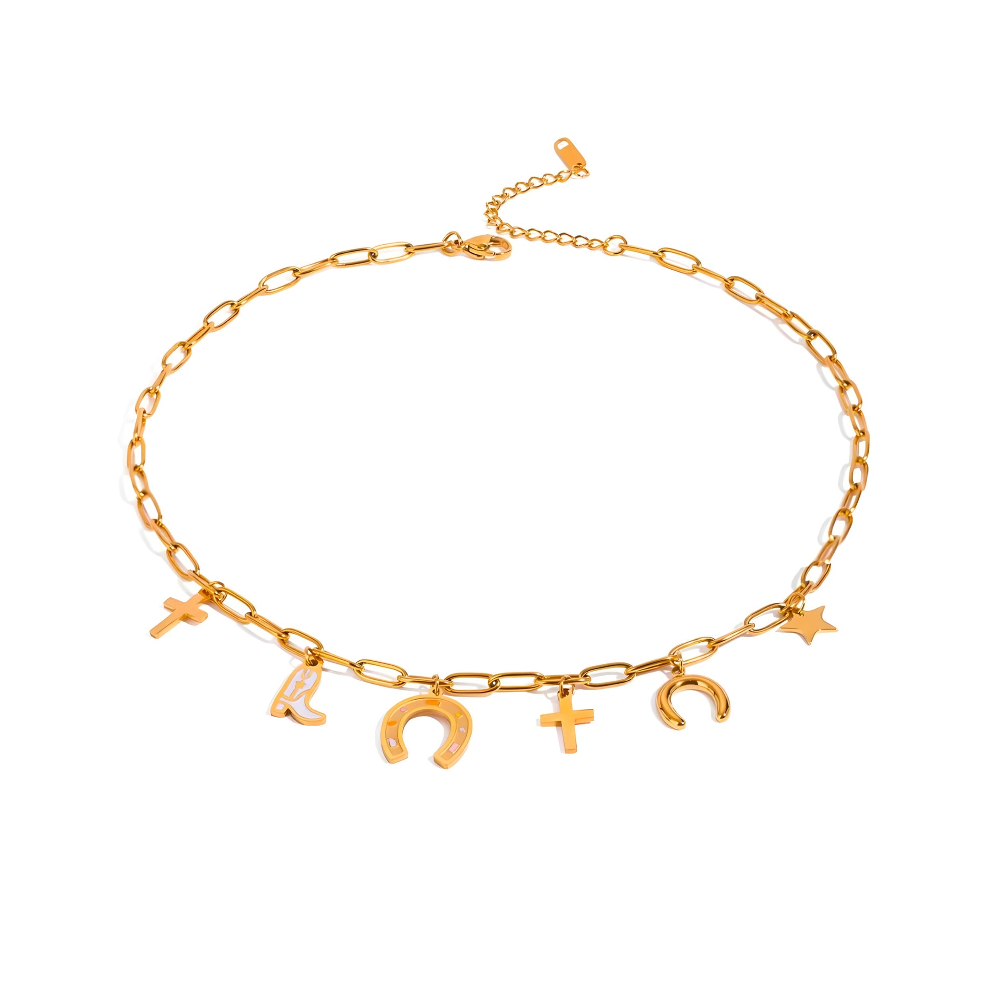 This gold charm necklace features a bold, modern design with a playful mix of symbols and motifs hanging from the chain. The necklace is crafted from gold links and includes an eclectic assortment of charms such as a cross, horseshoe, boot, and star. Each charm is carefully crafted, with some featuring subtle enamel details that add a dynamic contrast to the gold finish. The combination of meaningful symbols makes this piece a unique statement accessory, full of personal flair and charm.
