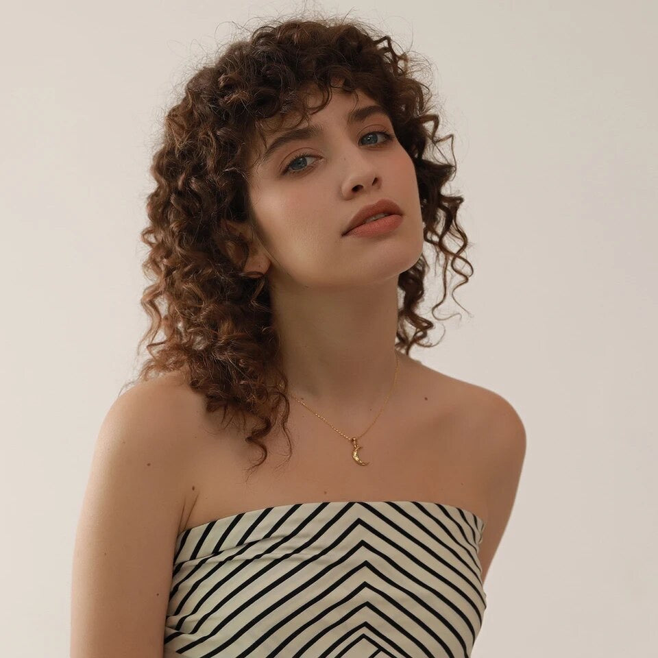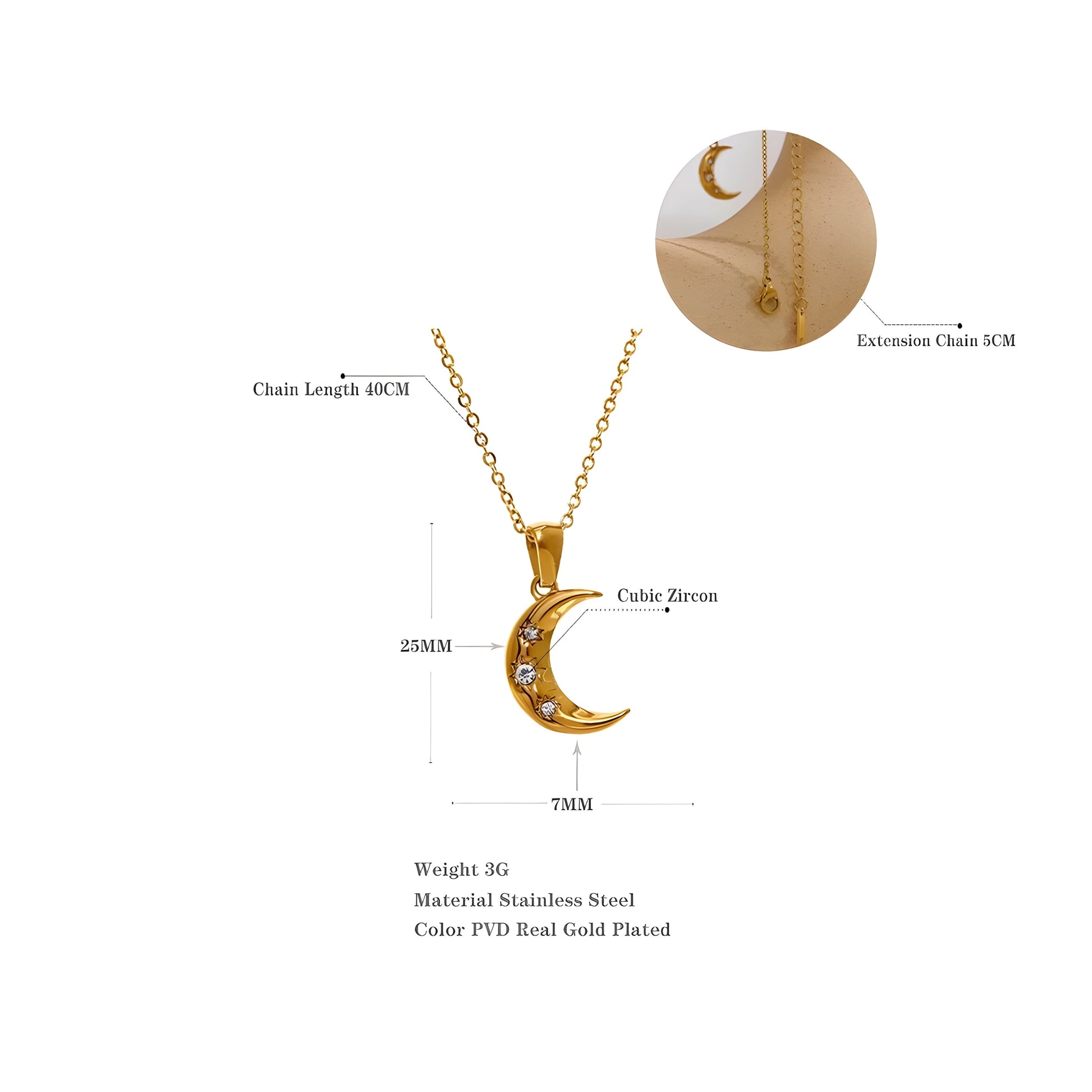 This necklace features a delicate crescent moon pendant adorned with small stars, making it both mystical and elegant. The shiny gold plating contrasts beautifully with the clear rhinestones, adding a touch of sparkle that catches the light. It’s the perfect accessory for someone who enjoys subtle celestial symbolism or wishes to add a unique yet refined element to their outfit.