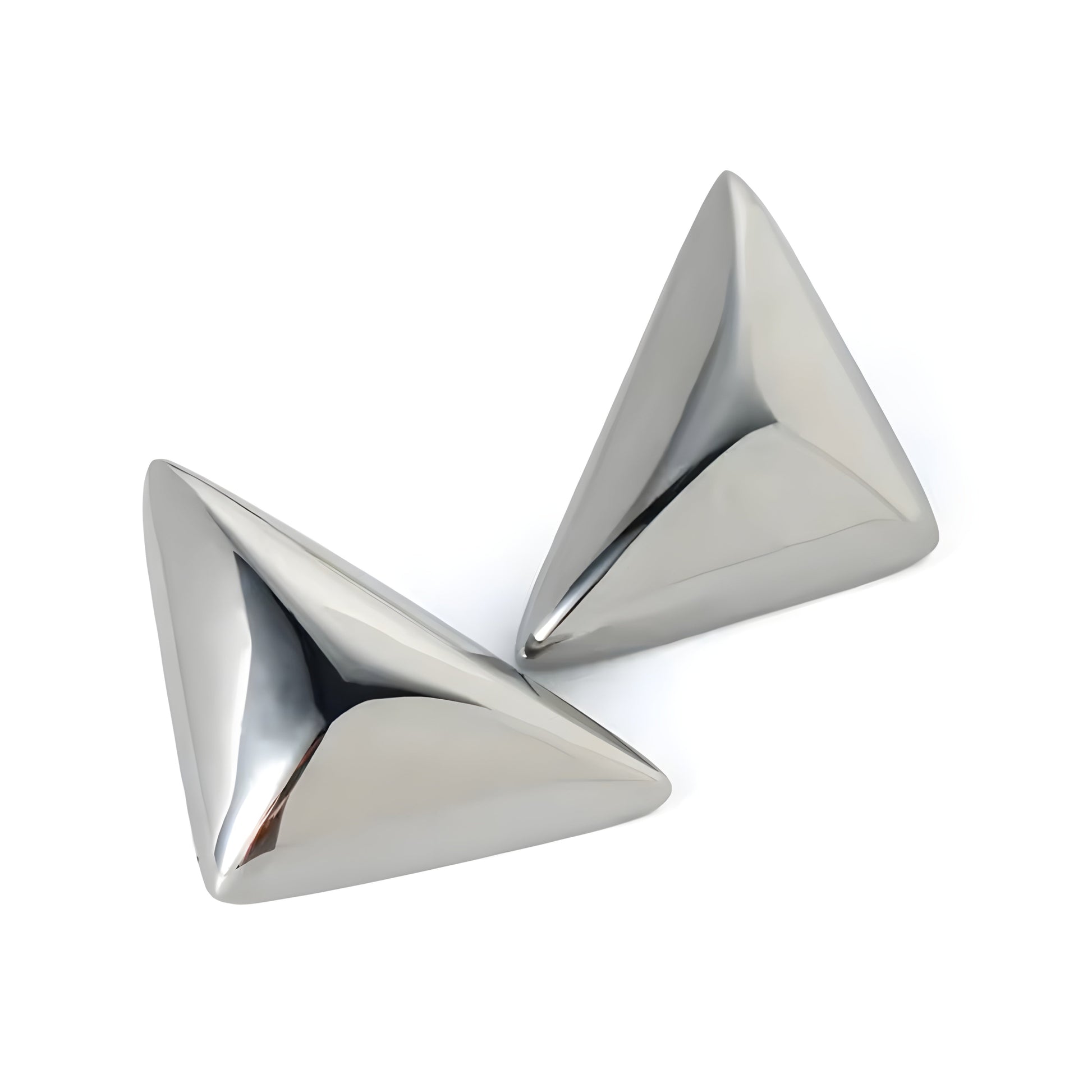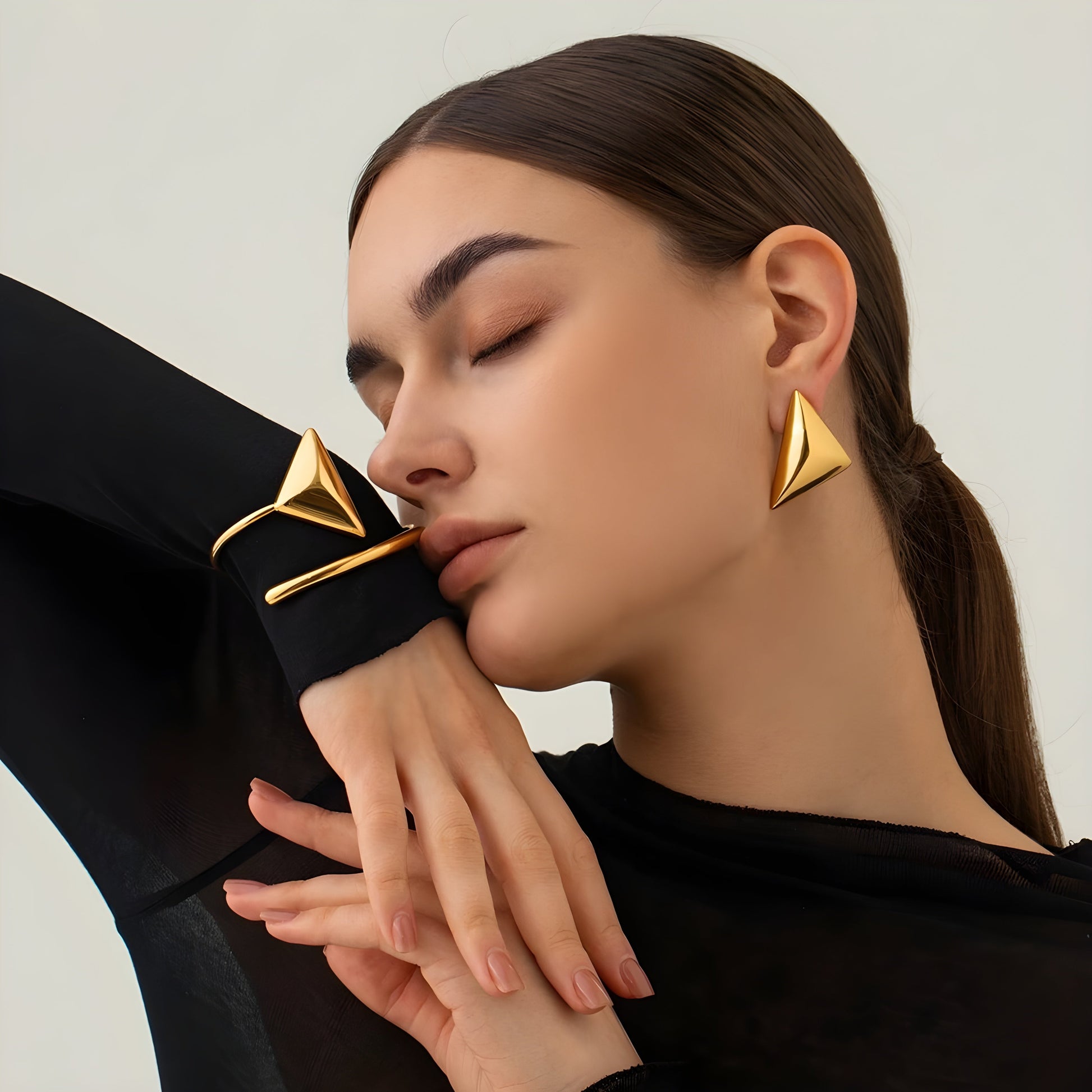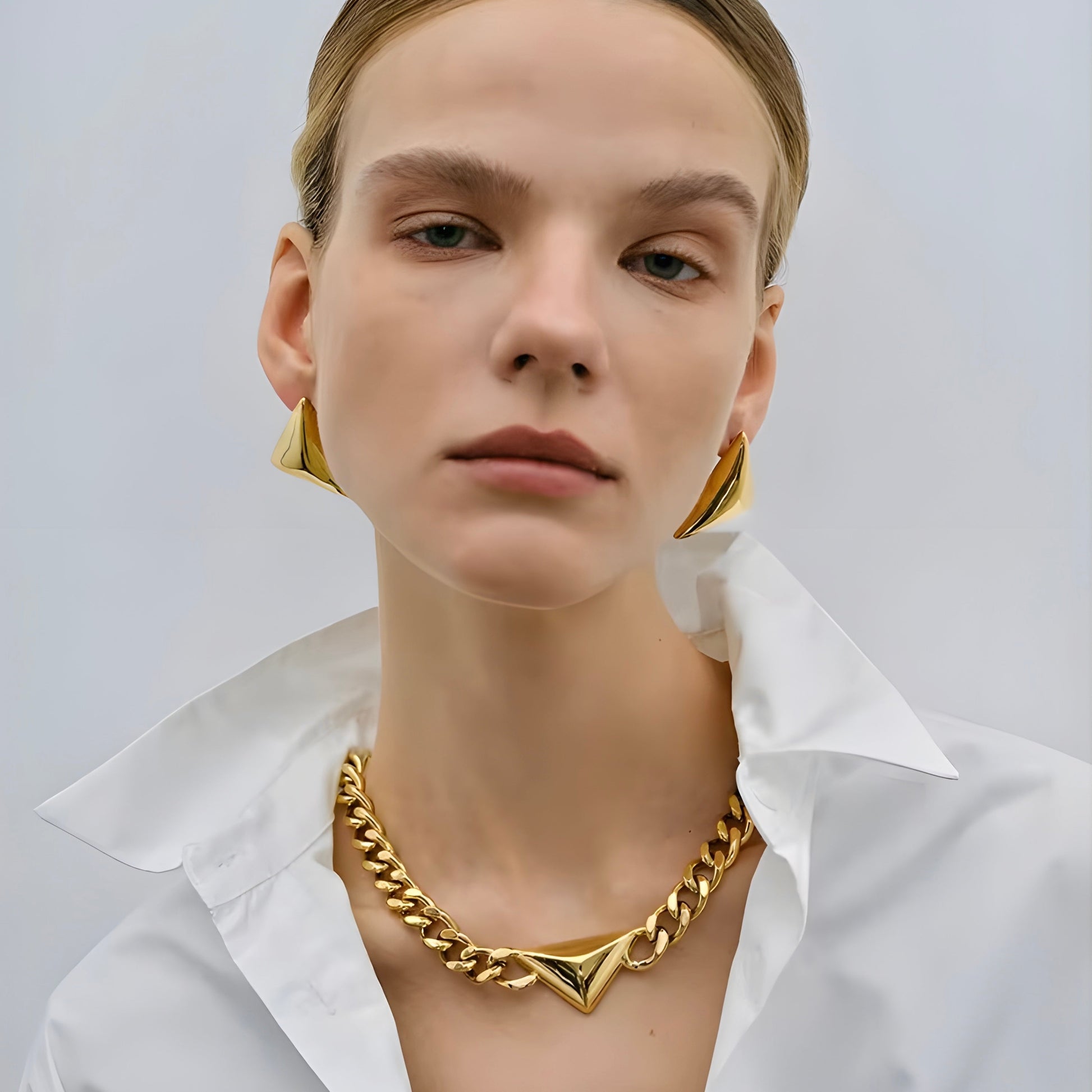 This bold, geometric gold earring with a triangular, glossy design exudes modern minimalism and elegance. ideal for pairing with simple monochrome outfits like black or white dresses, creative avant-garde looks, or sleek formal attire. It draws attention to the face and works well as a statement accessory. A matching bracelet or necklace in a similar design enhances the look, and simple makeup with tied-back hair keeps the focus on the earrings.