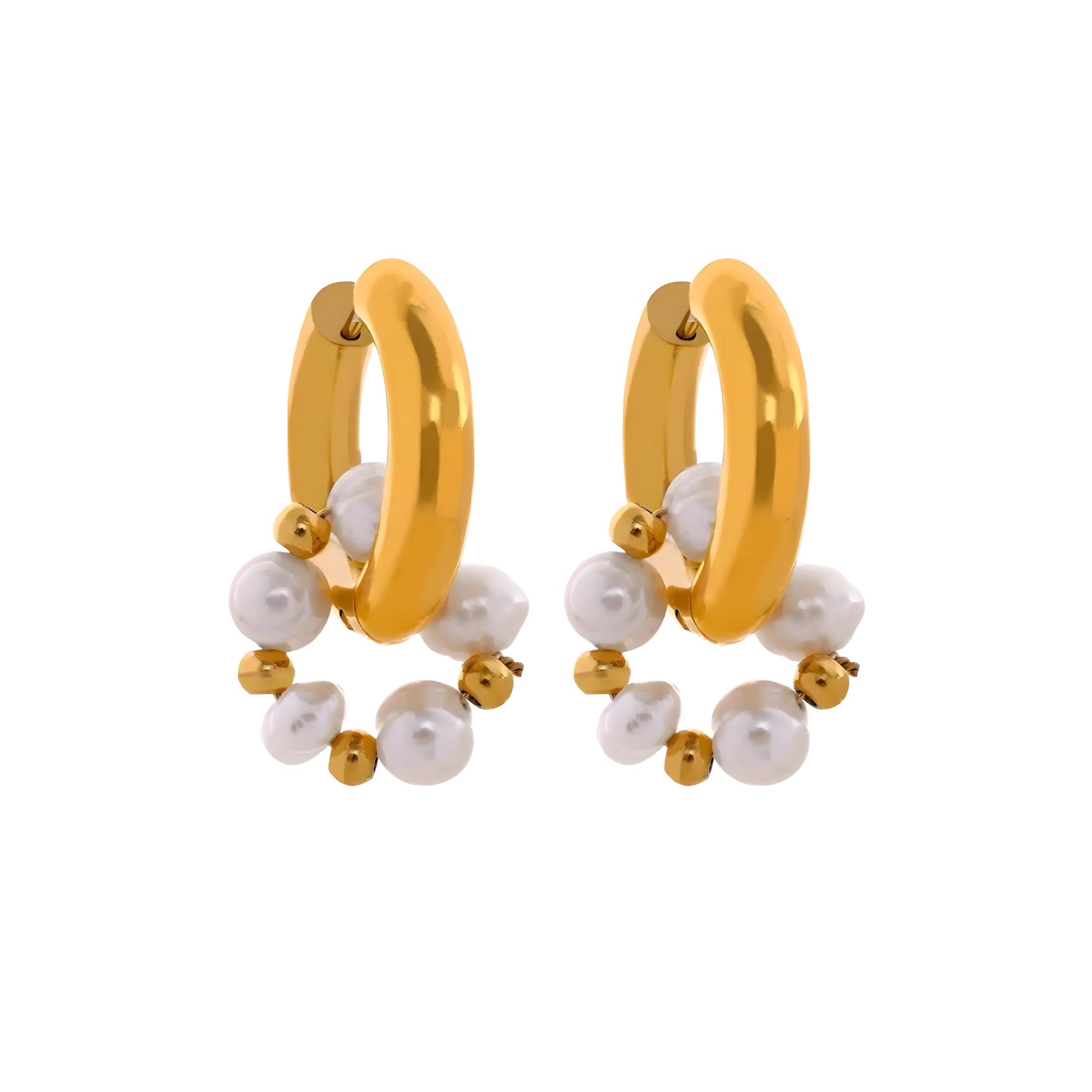 These earrings feature a bold yet elegant design, with a smooth golden hoop and several lustrous pearls paired with small golden beads. The pearls are arranged in a cluster around the hoop, creating a balanced and eye-catching aesthetic. The combination of gold and pearls makes them feel both modern and timeless, with a touch of luxury.