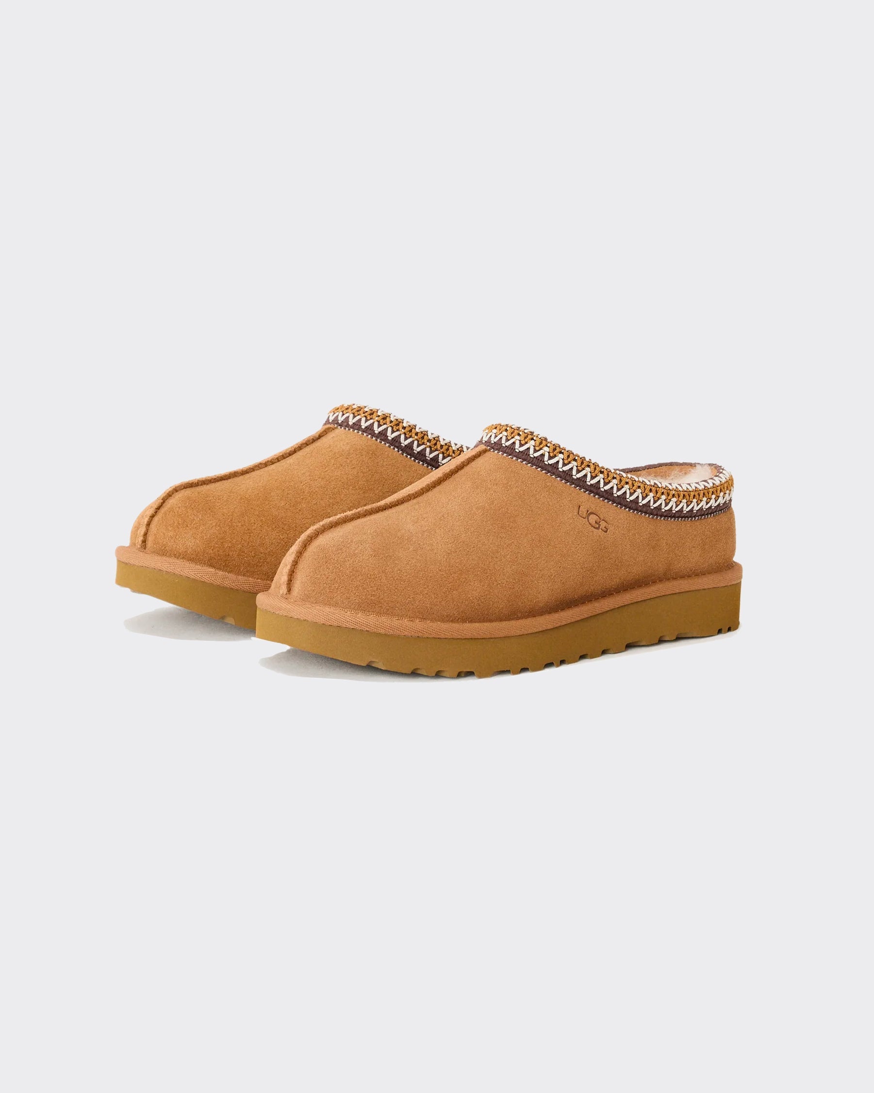 Colore marrone castagna con dettagli in tessuto sulla parte superiore. Cuciture decorative sulla punta e bordo intrecciato marrone e bianco. Logo inciso sul fianco della suola.