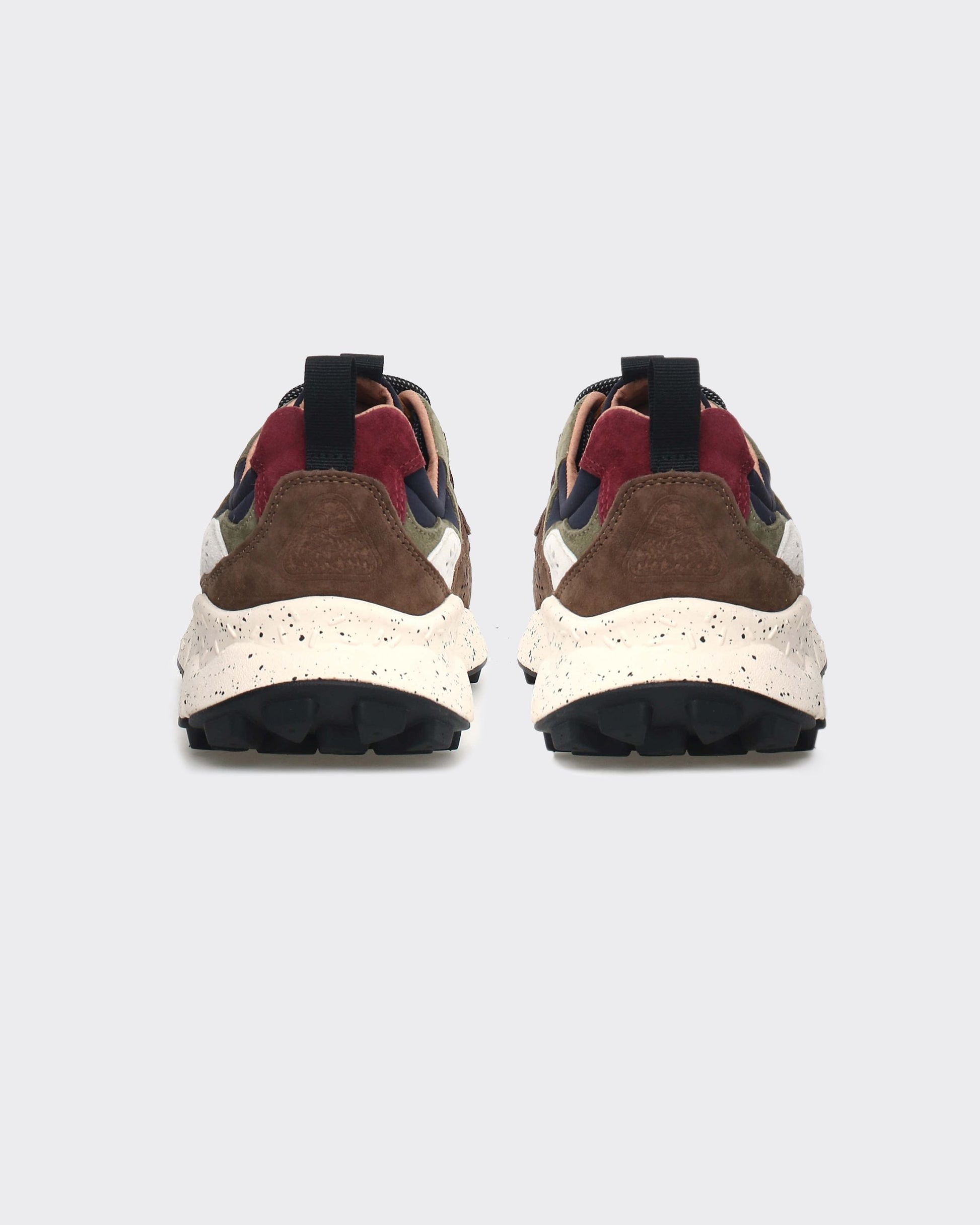 Sneakers in marrone e blu navy con dettagli in tessuto scamosciato e mesh. Presentano una suola maculata bianca e nera, ed elementi decorativi in rilievo sul fianco. Linguetta multicolore e anello tiralampo sul tallone.